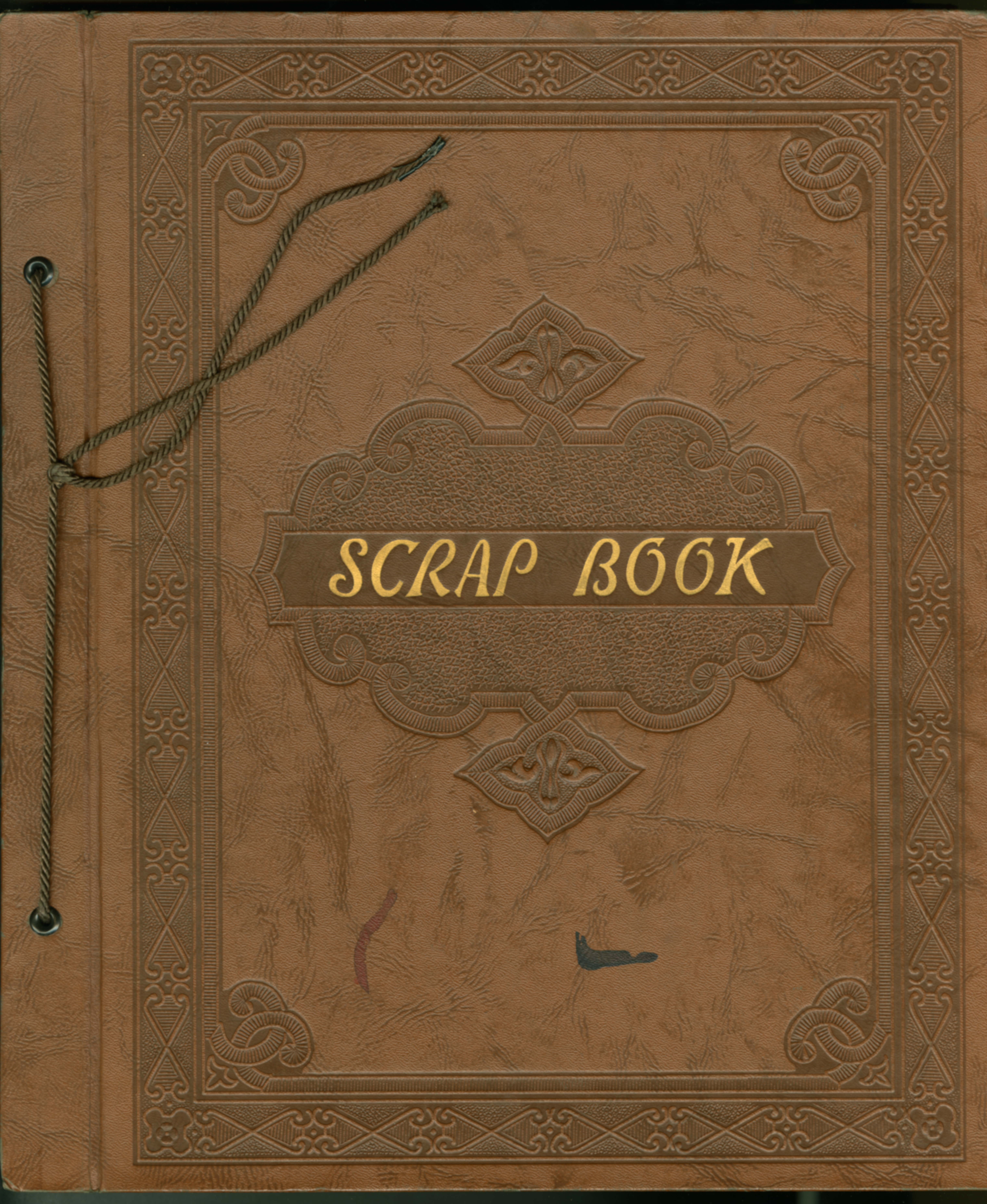Brown leather cover with blind tooled design and Scrap Book in gold tooling. Brown cord along left side.