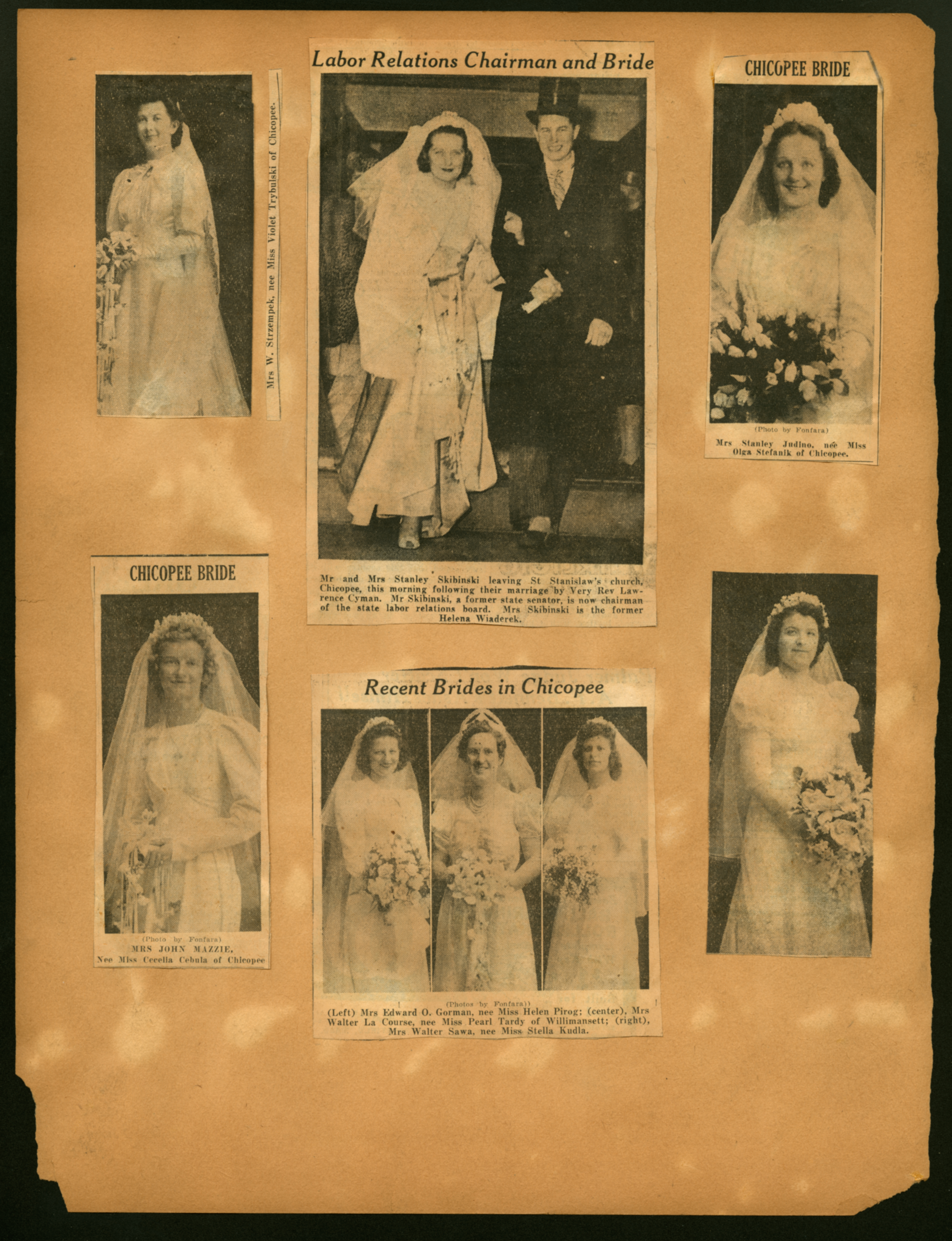 Scrapbook page with 6 newspaper clippings of Brides and one Groom; (Undated); Mrs W. Strzempek/ Violet Trybulski; Mr. Stanely Skibinski; Mrs Stanely Skibinski/ Helen Wiaderek; Mrs Stanely Jubino/ Miss Olga Stefanik; Mrs John Mazzie/ Miss Cecelia Cebula; Mrs Edward O. Gorman/ Miss Helen Pirog; Mrs Walter La Course/ Miss Pearl Tardy; Mrs Walter Sawa/ Miss Stella Kudla