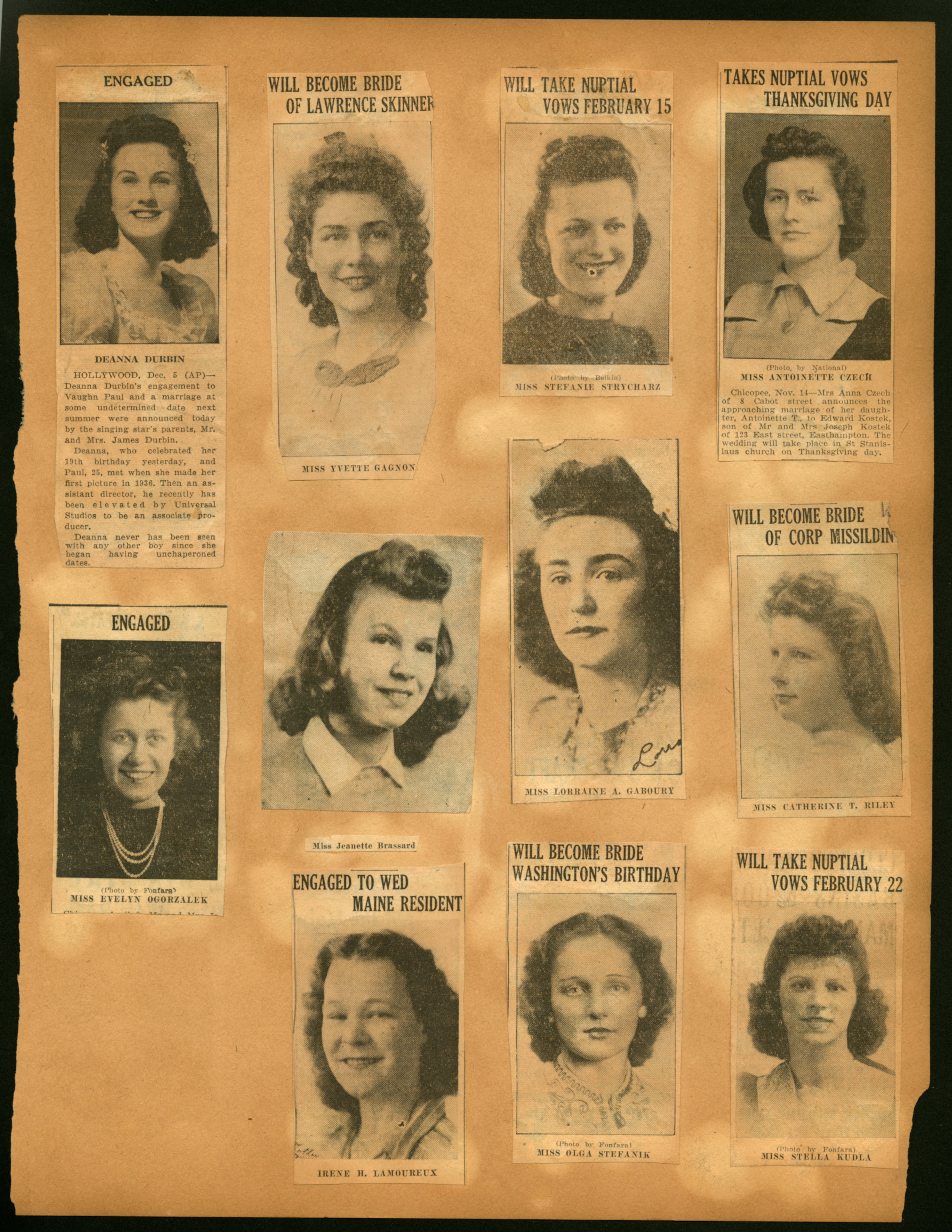 Scrapbook page with 11 newspaper clippings of Brides to be; (Undated); Deana Derbin; Miss Yvette Gagon; Miss Stefanie Strycharz; Miss Antoinette Czech; Miss Evelyn Ogorzalek; Miss Jeanette Brassard; Miss Lorraine A. Gaboury; Miss Catherine T. Riley; Irene H. Lamoureux; Miss Olga Stefanik; Miss Stella Kudla