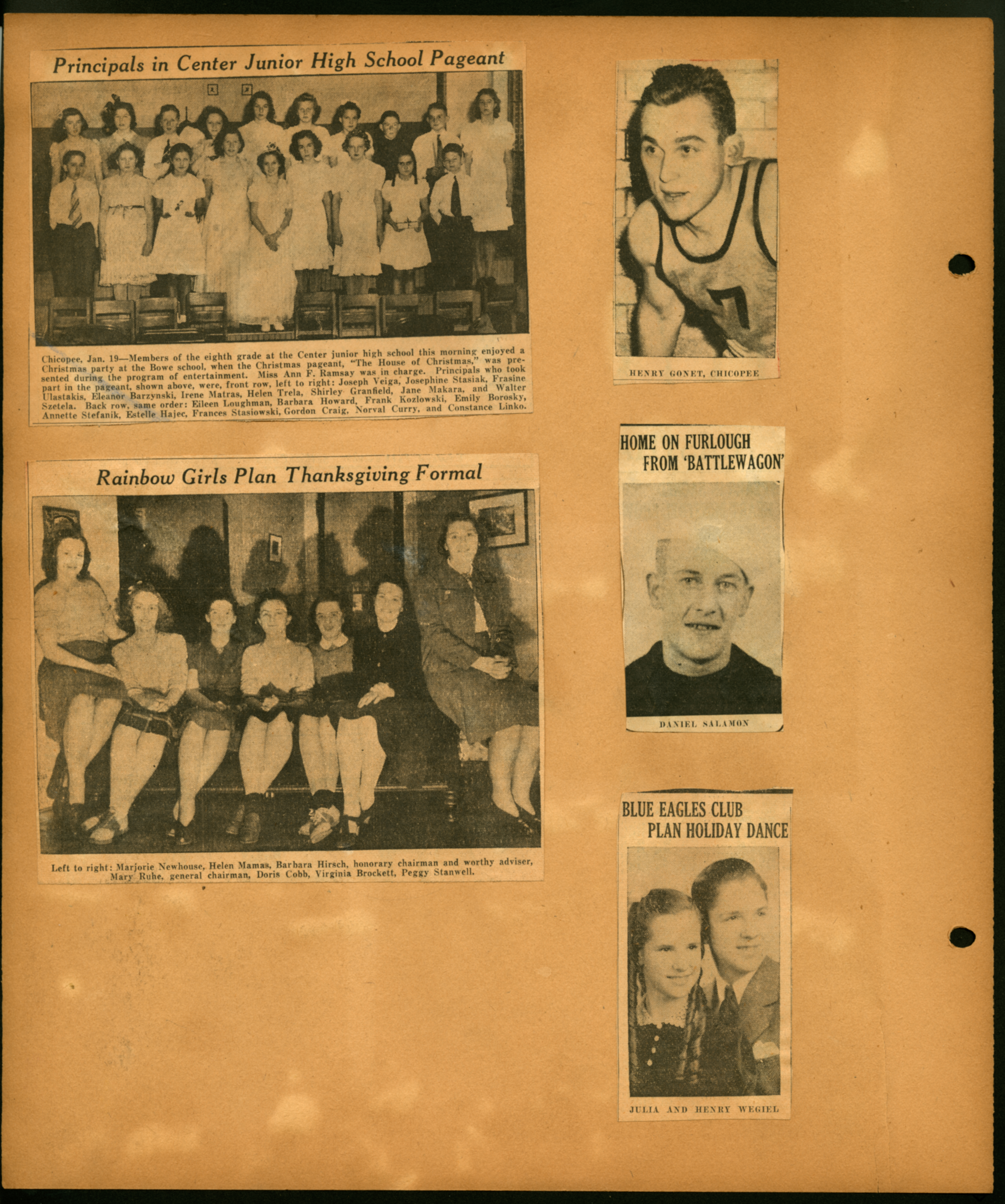 Scrapbook page with 5 newspaper clippings of local events; (Undated); Henry Gonet; Daniel Salamon; Julia Wegiel; Henry Wegiel; Marjorie Newhouse; Helen Mamas; Barbara Hirsch; Mary Ruhe; Doris Cobb; Virginia Brocket; Peggy Stanwell