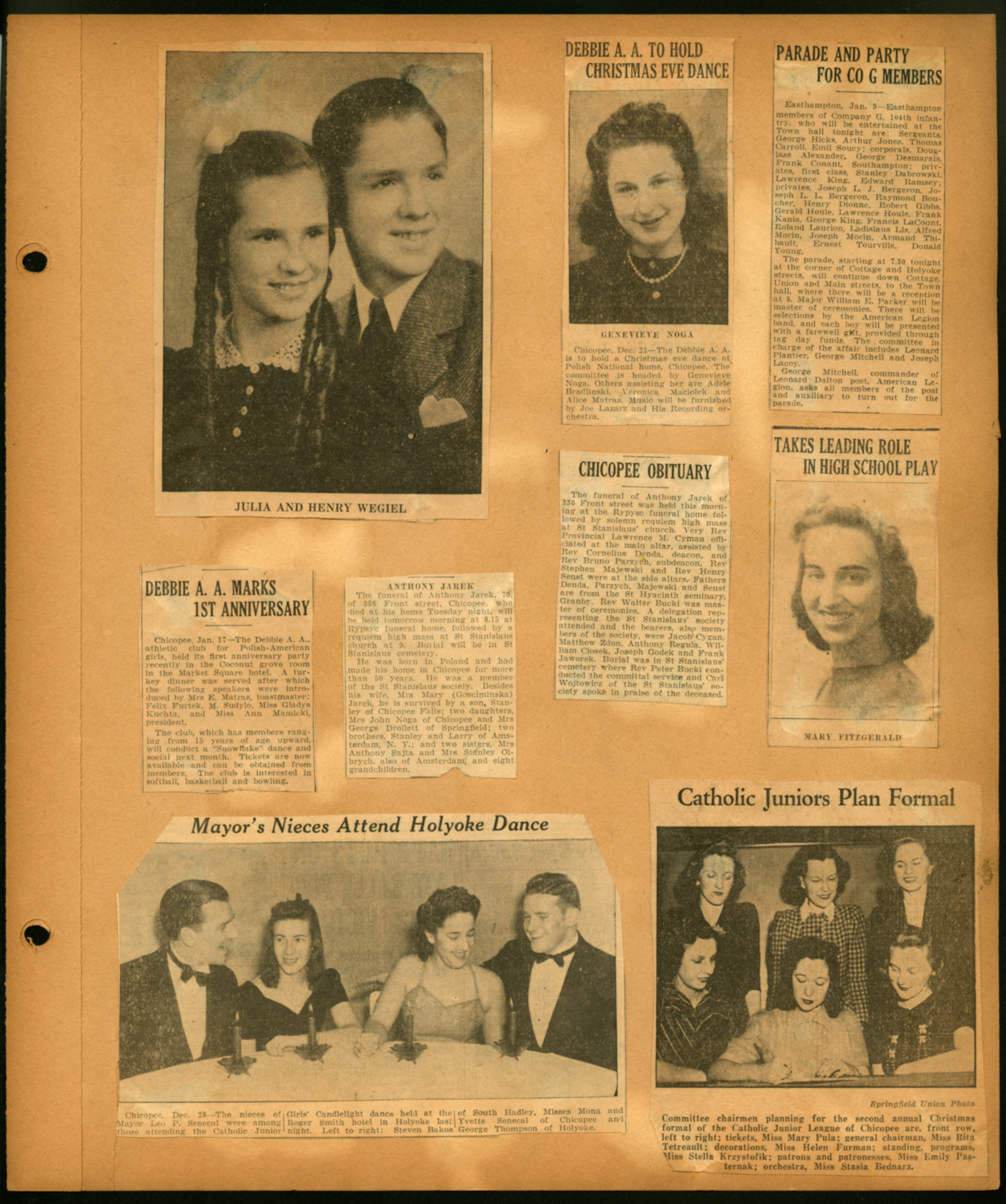 Scarpbook page with 9 newspaper clippings; (Undated); Julia Wegiel; Henry Wegiel; Genevieve Noga; George Hicks; Arthur Jones; Thomas Carrol; Emil Souey;Douglas Alexander; Frank Connat; George Desmarais; Stanely Dabrowski; Lawrence King; Edward Ramsey; Joseph L. J. Bergeron; Joseph L. L. Bergeron; Raymond Boucher; Henry Dionne; Robert Gibbs; Gerald Houle; Lawrence Houle; Frank Kania; George King; Francis LaCount; Roland Laurion; Ladislaus Lis; Alfred Morin; Joseph Morin; Armand Thibault; Ernest Tourville; Donald Young; Mary Fitzgerald; Emily Pasternak; Stasia Bednarz; Mona Senecal; Leo P. Senecal; Yvette Senecal; Gladys Kuchta; Anthony Jarek; Ann Mamicki;