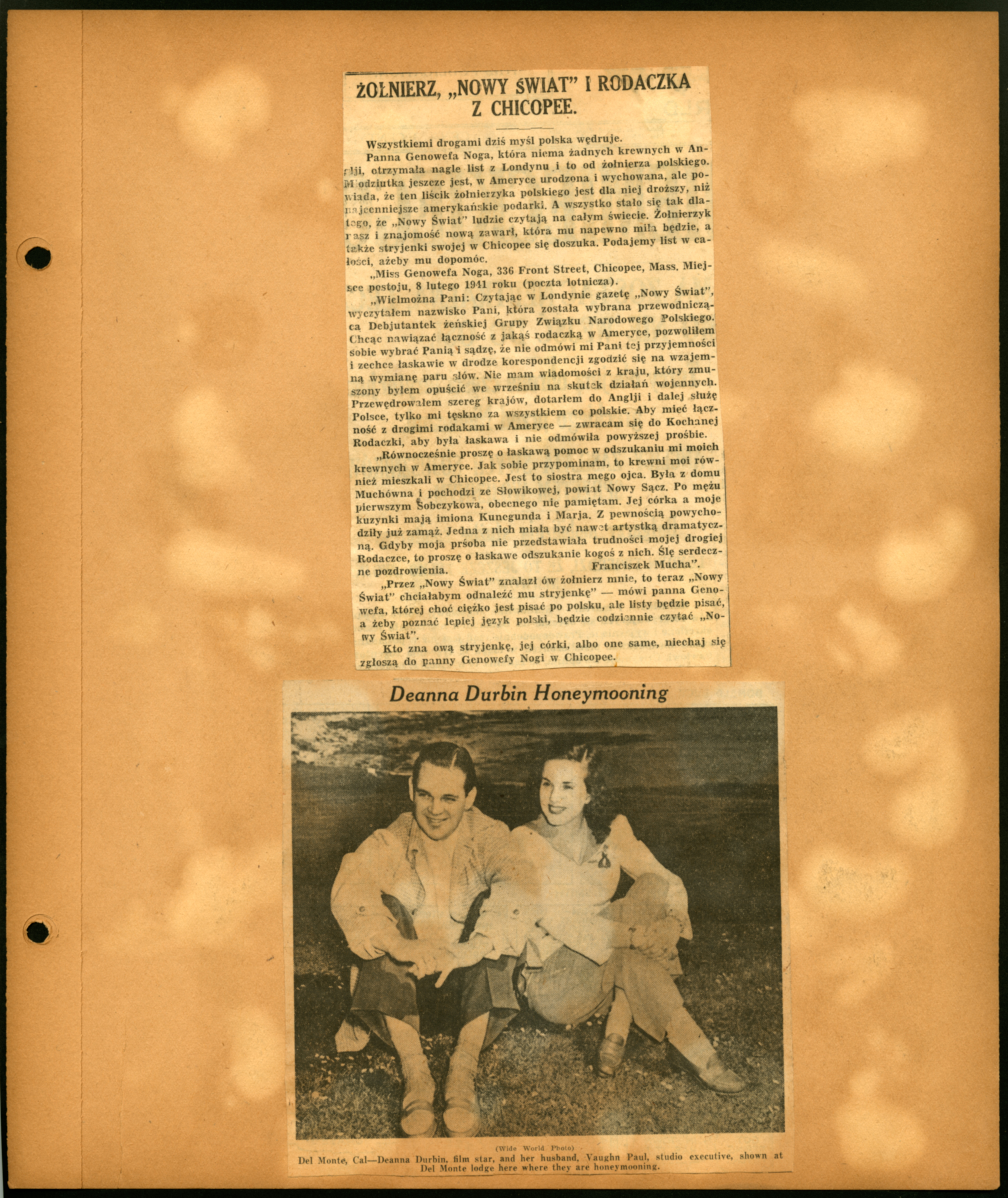 Scrapbook Page with 2 newspaper clippings;[ 1st newspaper written in Polish] ;(Undated); Genowefa Noga; Deanna Durbin; Vaughn Paul