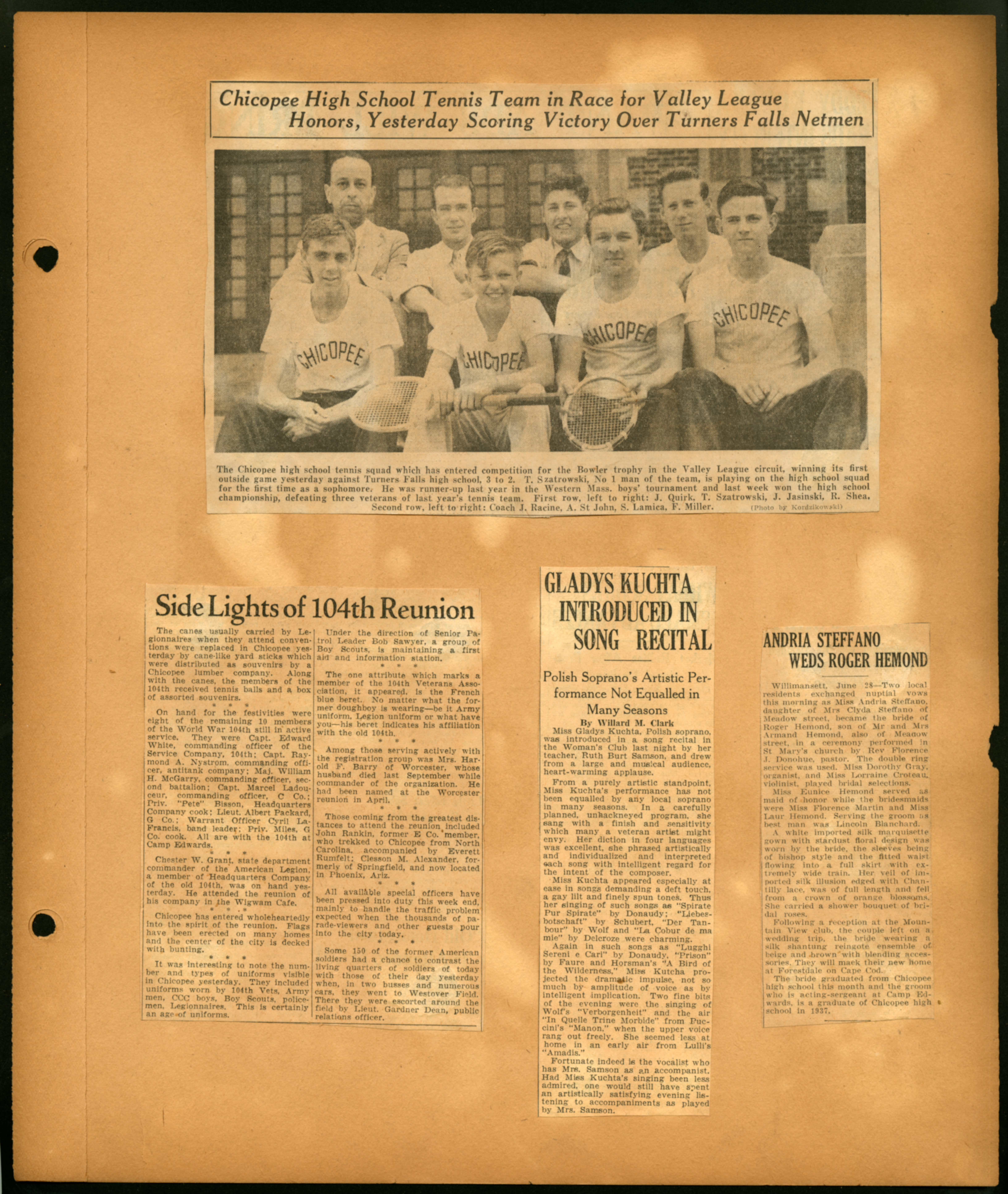 Scrapbook page with 4 newspaper clippings of local Chicopee news; (Undated); Chicopee High Tennis Team; J. Quirk; T. Szatrowski; J. Jasinski; R. Shea; A. St. John; S. Lamica; F. Miller; Coach J. Racine; Gladys Kuchta; Andria Steffano; Lieut. Gardner Dean;
