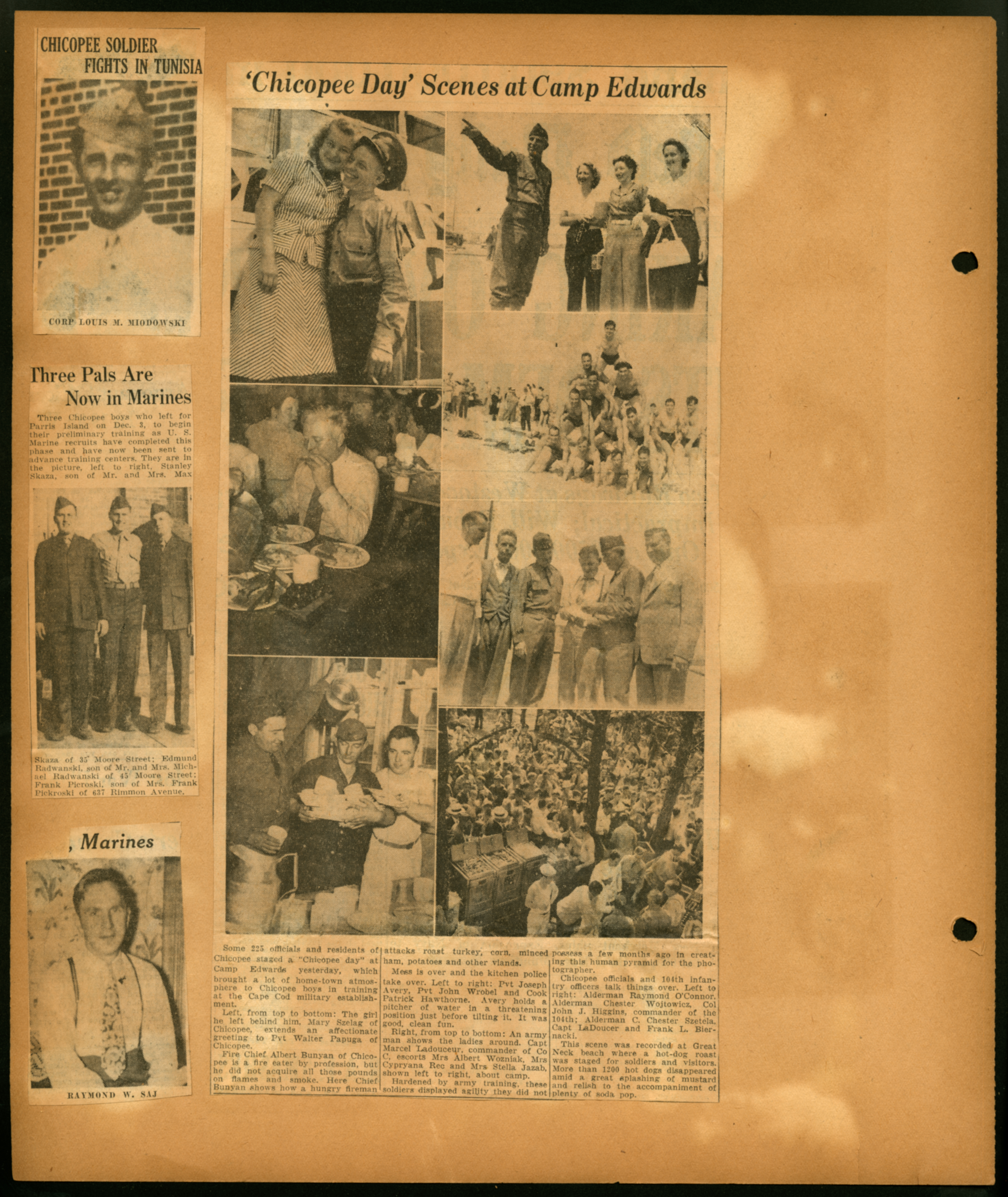 Scrapbook page with 4 newspaper clippings of Chicopee Day and Local soldiers in the army; (Undated); Corporal Louis M. Miodowski; Edmund Radwanski; Frank Picroski; Stanely Skaza; Raymond W. Saj; Mary Szelag; Walter Papuga; Albert Bunyan; Pvt Joseph Avery; Pvt John Wrobel; Cook Patrick Hawkthorne; Marcel Ladouceur; Albert Wozniak; Mrs Cyprana Rec; Mrs Stella Jazab; Alderman Raymond O'Connor; Alderman Chester Wojtowicz; Col John J. Higgins; Alderman Chester Szetela; Capt. Ladoucer; Frank L. Biernacki;