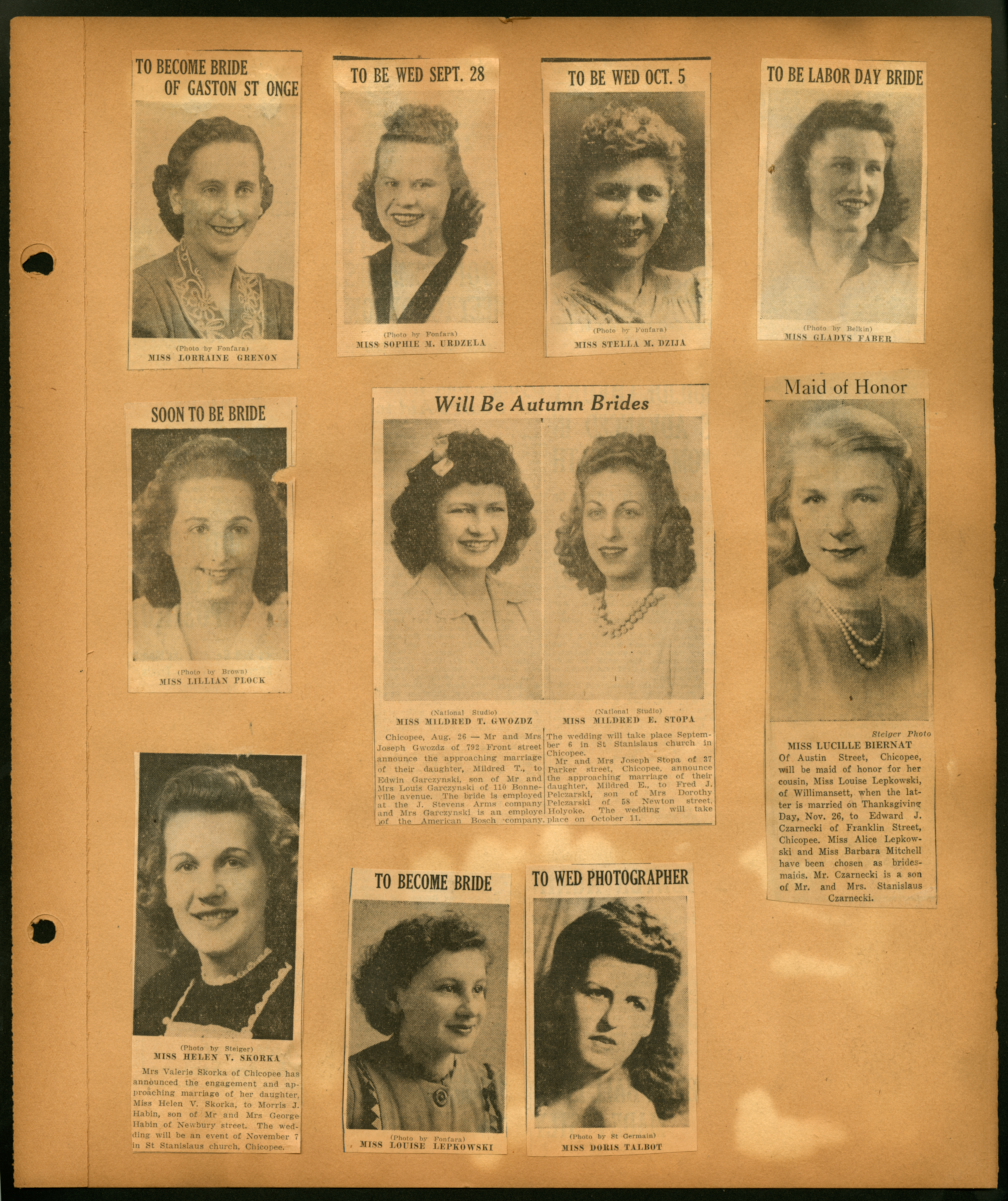 Scrapbook page 10 newspaper clippings of Brides to be;( Undated); Miss Lorraine Grenon; Miss Sophie M. Urdzela; Miss Stella M. Dzija; Miss Gladys Faber; Miss Lillian Plock; Miss Mildred T. Gwozdz; Miss Mildred E. Stopa; Miss Lucille Biernat; Miss Helen V. Skorka; Miss Louise Lepkowski; Miss Doris Talbot