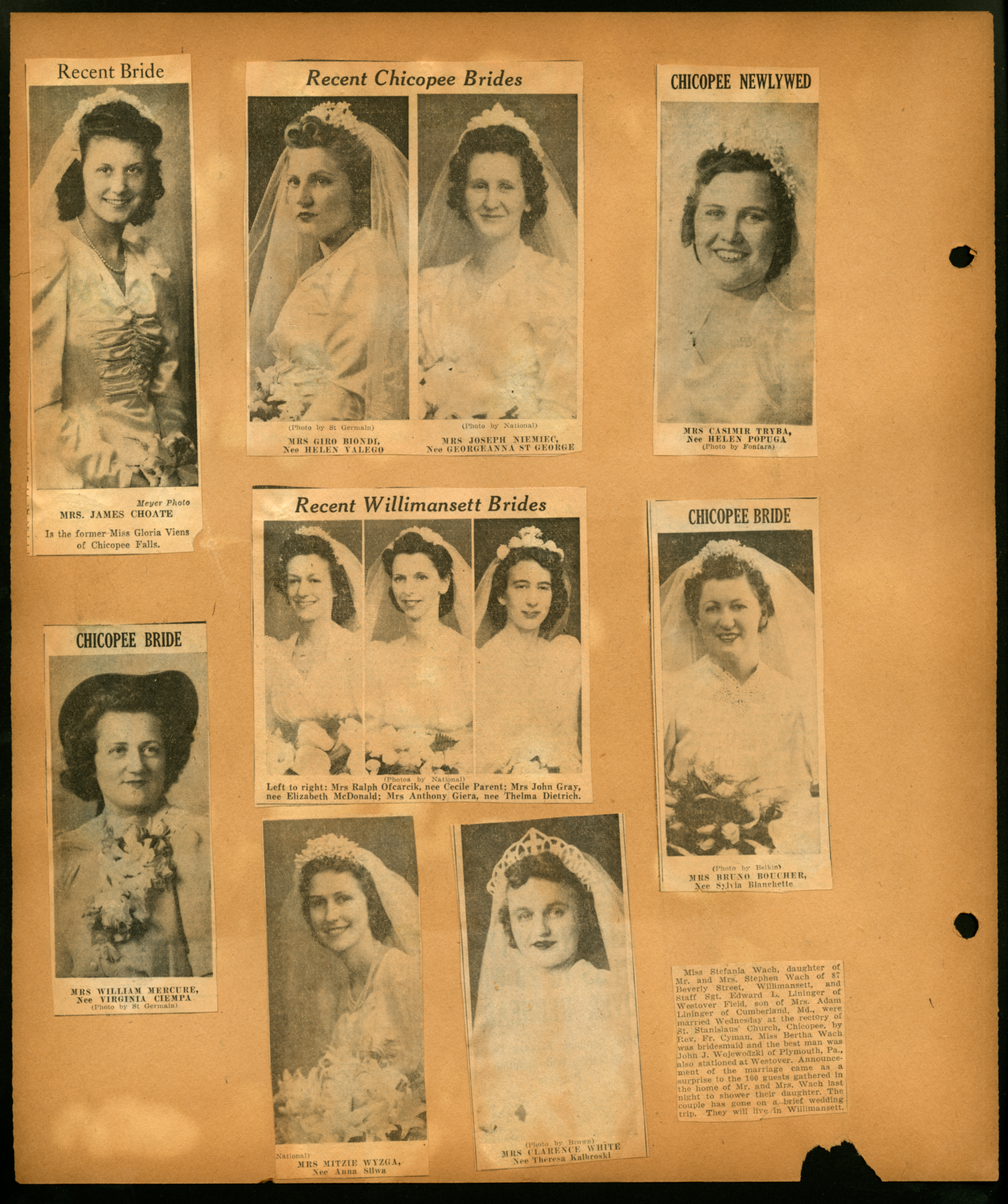 Scrapbook page with 9 newspaper clippings of Newlyweds; (Undated); Mrs James Choate/ Miss Gloria Viens; Ms Giro Biondi/ Miss Helen Valego; Mrs Joseph Niemiec/ Miss Gergeanna st Geroge; Mrs Casimir Tryba/ Helen Popuga; Mrs William Mercure/ Miss Virginia Ciempa; Mrs Mitzie Wyzga/ Miss Anna Silwa; Mrs Clarence White/ Miss Theresa Kalbroski; Mrs Brubo Boucher/ Miss Sylvia Blanchette; Mrs Ralph Ofcarccik/ Miss Cecile Parent; Mrs John Gray/ Miss Elizabeth Mcdonald; Mrs Anthony Giera/ Miss Thelma Dietrich; Miss Setfania Welch