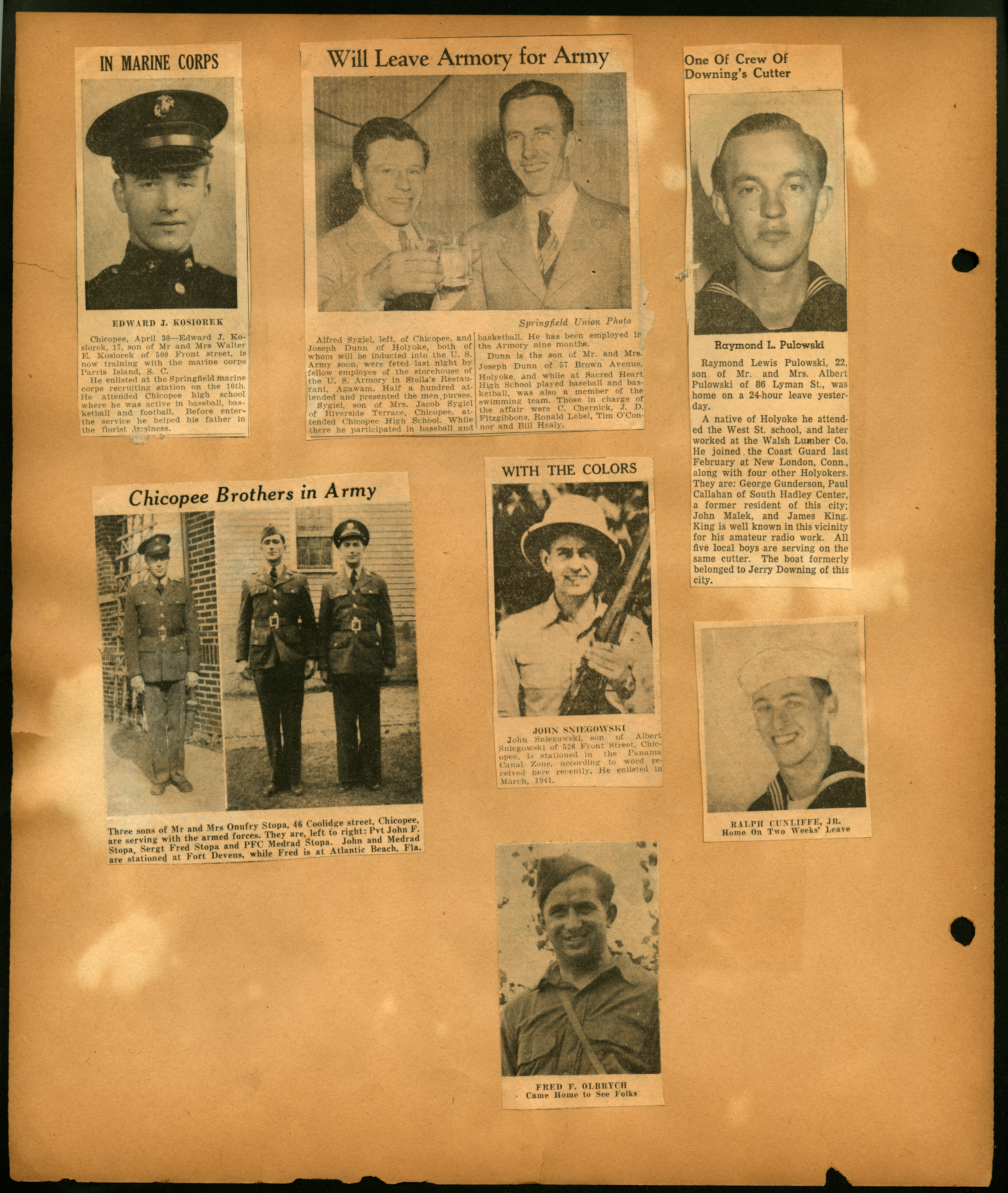 Scrapbook page with 7 newspaper clippings of Military news; (Undated);Edward Kosiorek; Raymond L. Pulowski; Ralph Cunliffe Jr.; Fred F. Olbrych; John Sniegowski; Pvt John F. Stopa; Sergt Fred Stopa; PFC Mefrad Stopa; Alfred Sygiel; Joseph Dunn