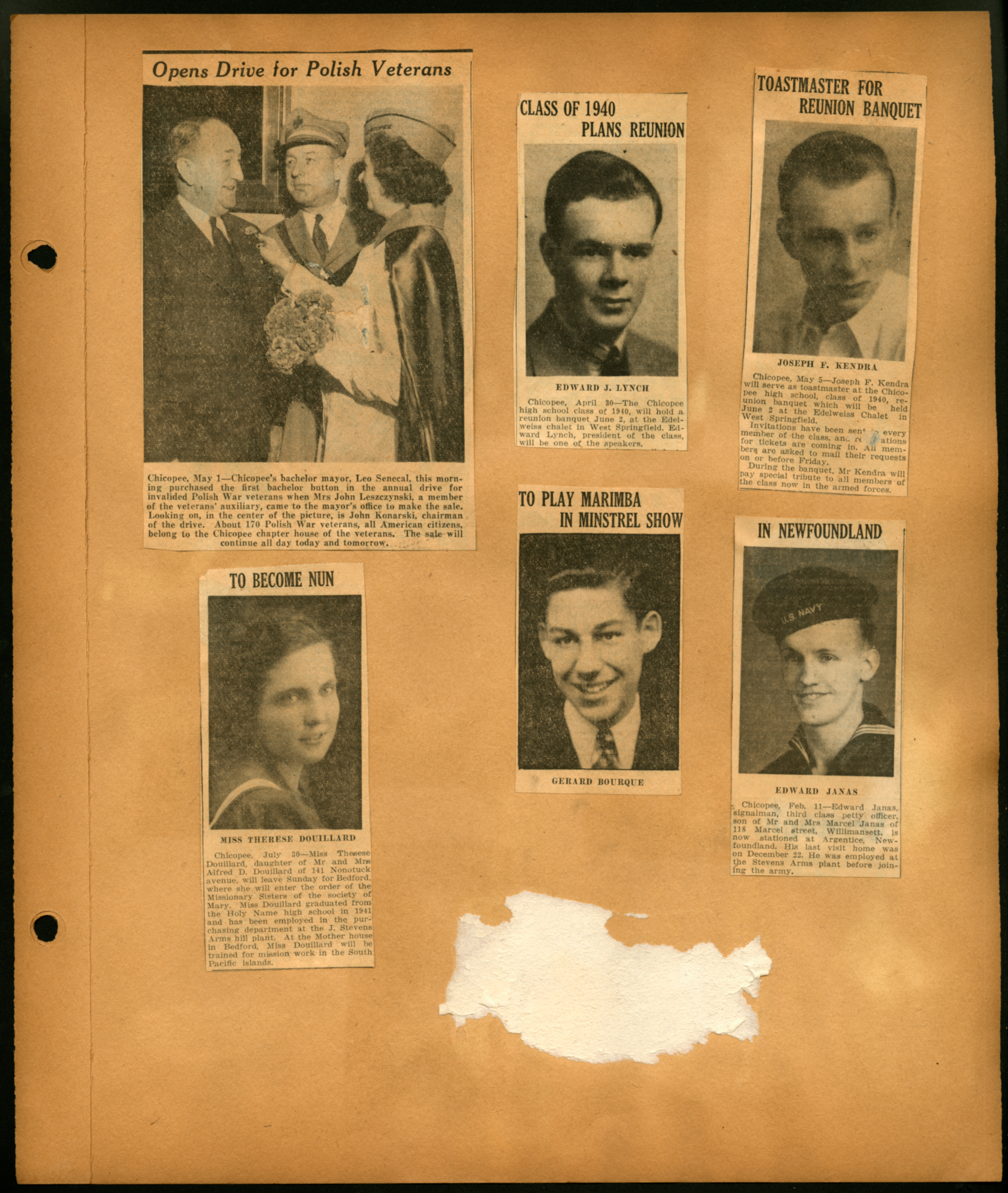 Scrapbook page with 6 newspaper clippings of a local Chicopee reunion; (June 2, 1940); Edward J. Lynch; Joseph F. Kendra; Edward Janas; Gerard Bourque; Therese Doulliard; Leo Senecall; Mrs John Leszczynski; John Konarski;
