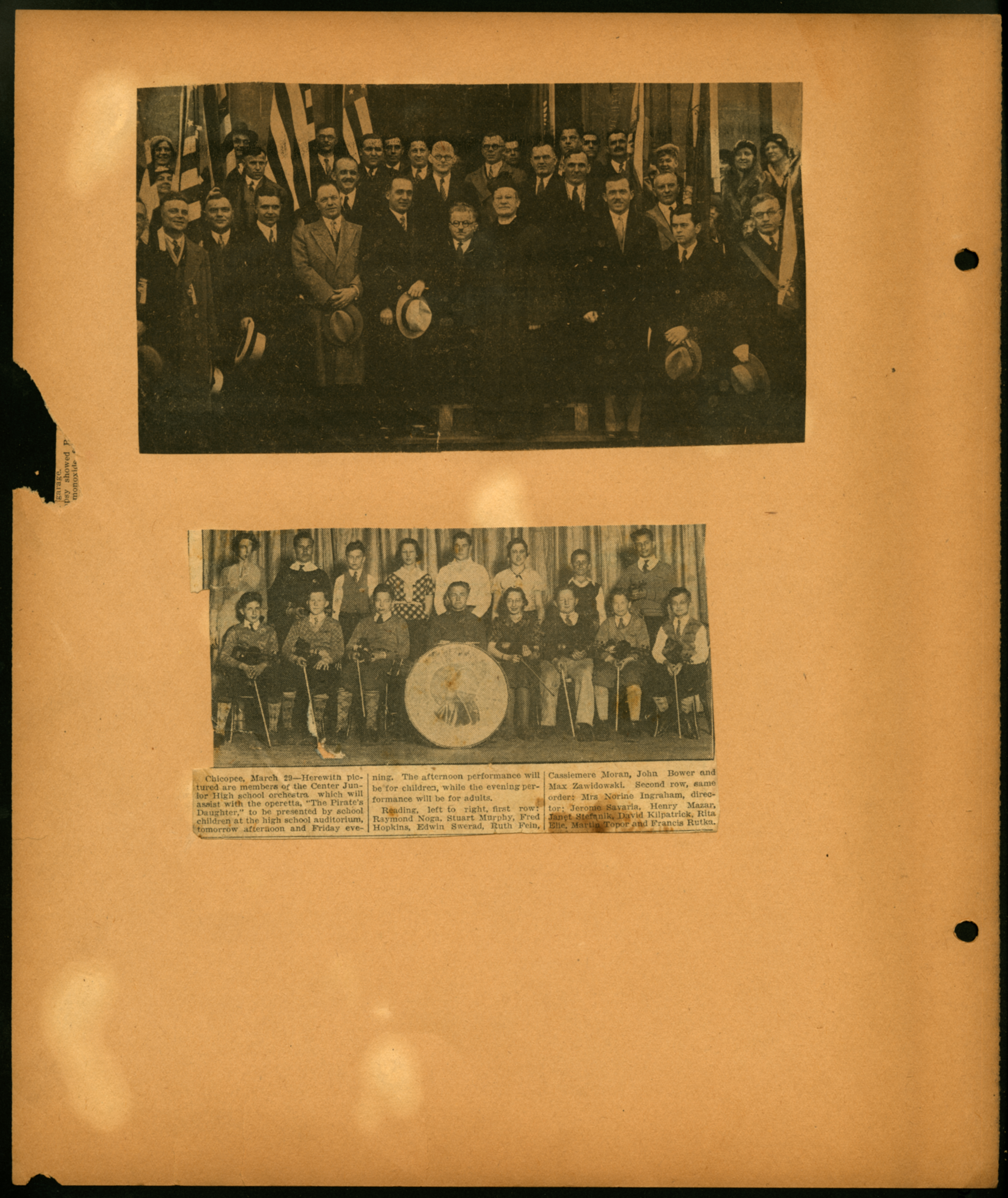 Scrapbook page with two newspaper clippings of Chicopee Photos; (March 29th); Raymond Noga; Stuart Murphy; Fred Hopkins; Edwin Swerad; Ruth Fein; Cassimere Moran; John Bower; Max Zawidowski; Mrs Norine Ingraham; Jerome Savaria; Henry Mazar; Janet Stefanik; David Kilpatrick; Rita Elie; Martin Topor; Francis Rutka