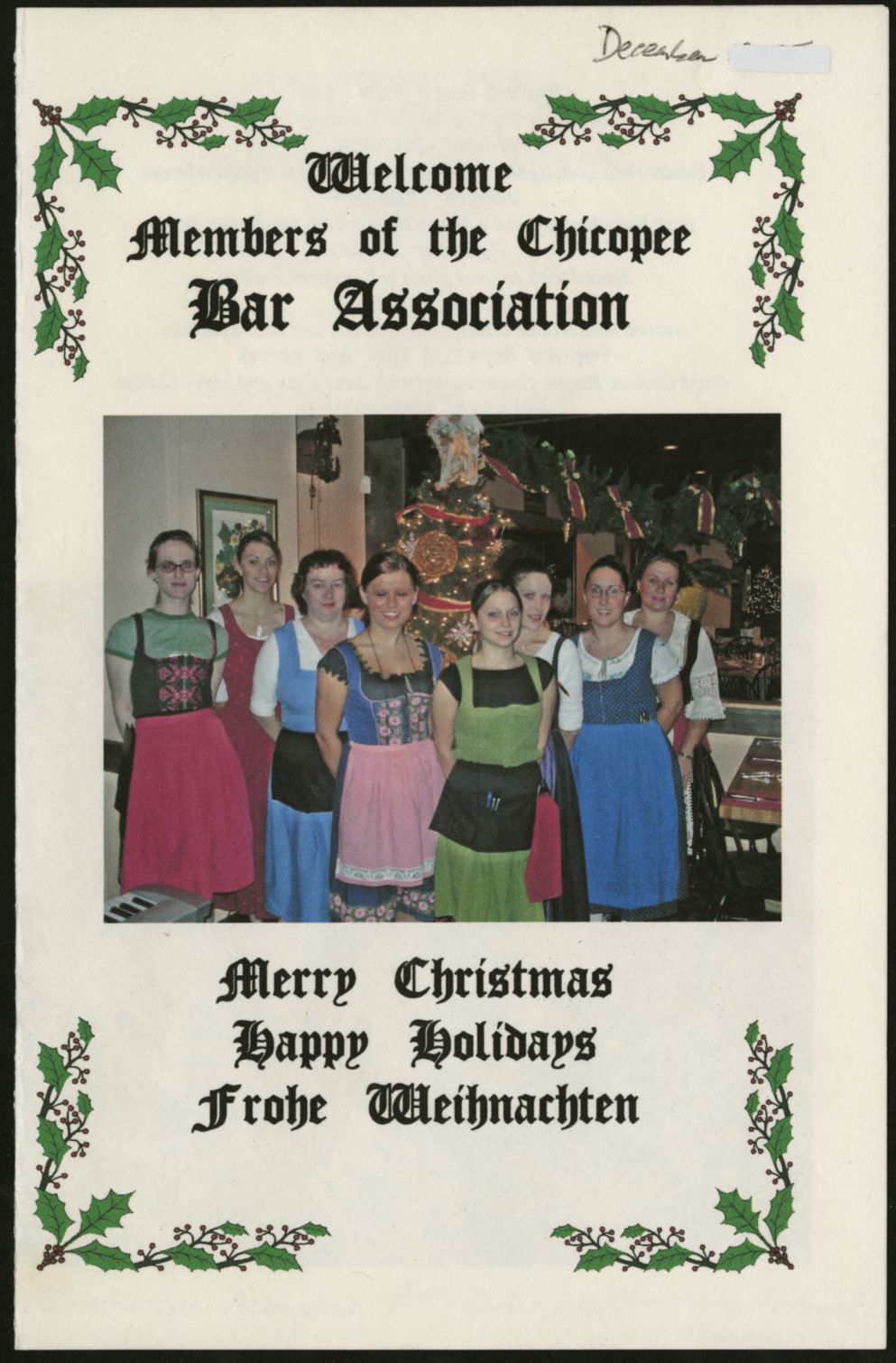 Front cover of a program for the Chicopee Bar Association holiday party, December 15, 2004, held at the Munich Haus restaurant in Chicopee MA. Front cover features a photo of the Munich Haus waitstaff, and reads "Welcome members of the Chicopee Bar Association; Merry Christmas; happy holidays; Frohe Weihnachten."