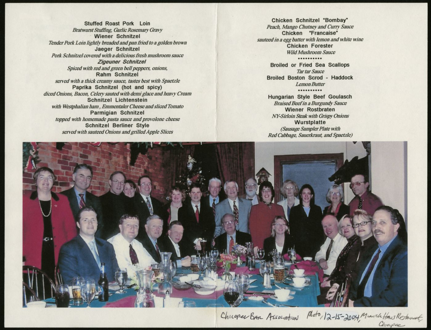 Inside spread of a program for the Chicopee Bar Association's 2004 holiday party. Program includes the menu, and a photograph of attending memebrs. Handwritten caption reads "Chicopee Bar Association photo, 12-15-2004, Munich Haus Restaurant, Chicopee." [Members identified by donor as: Seated left to right--Niles Courchesne; James Gelinas; Richard Gelinas; Joseph D'Amour; Archer Battista; Greta LaMountain; James Gregory; Marie Jablonski; Joanne McCarthy; John McCarthy. Standing, left to right--Mary Hurley; Richard Kos; Thomas Murhpy, Jr.; Susuan Phillips; Michael Bissonette; Laura McCarthy; Robert Lefebvre; Thomas Costello; Jeffrey Sagalyn; Unknown; Christine Lessing; Janet McMillan; Ellie Rosenbaum; Eileen Sorrentino; Paul Kozikowski.]