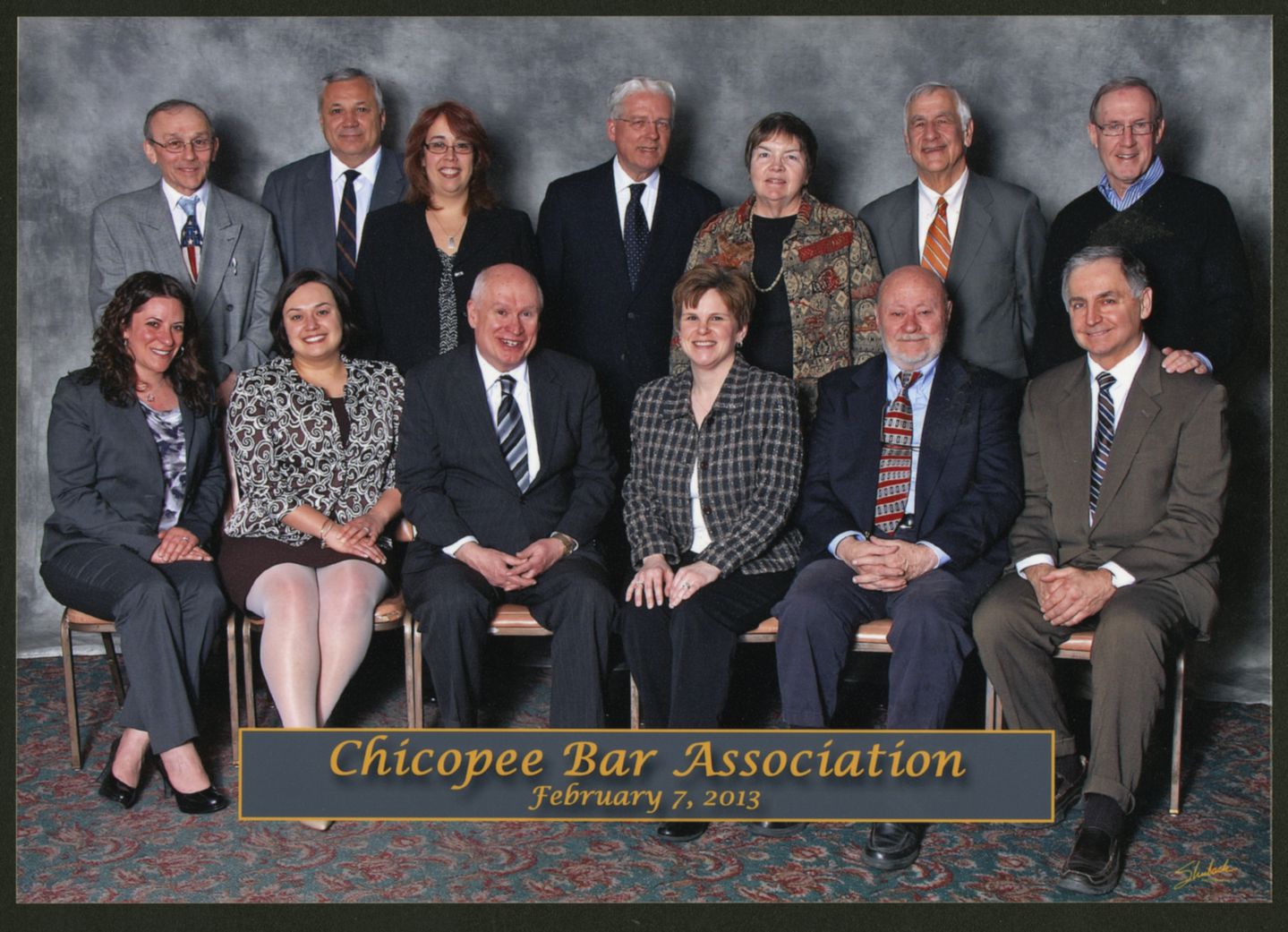 Color photograph of several people arranged for a group portrait, with the caption "Chicopee Bar Association, February 7, 2013." [Identified by donor as: seated, left to right: Ellie Rosenbaum, Gillian Szlachetka Dubay, James Gregory, Amy Bizon-Copp, Robert Nowak, Richard Kos. Standing, left to right: Paul Kozikowski, Stephen Sousa, Christine Lessing Provost, Thomas Costello, Mary Hurley, Jeffrey Sagalyn, Thomas Murphy, Jr."