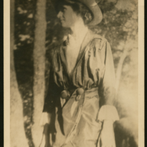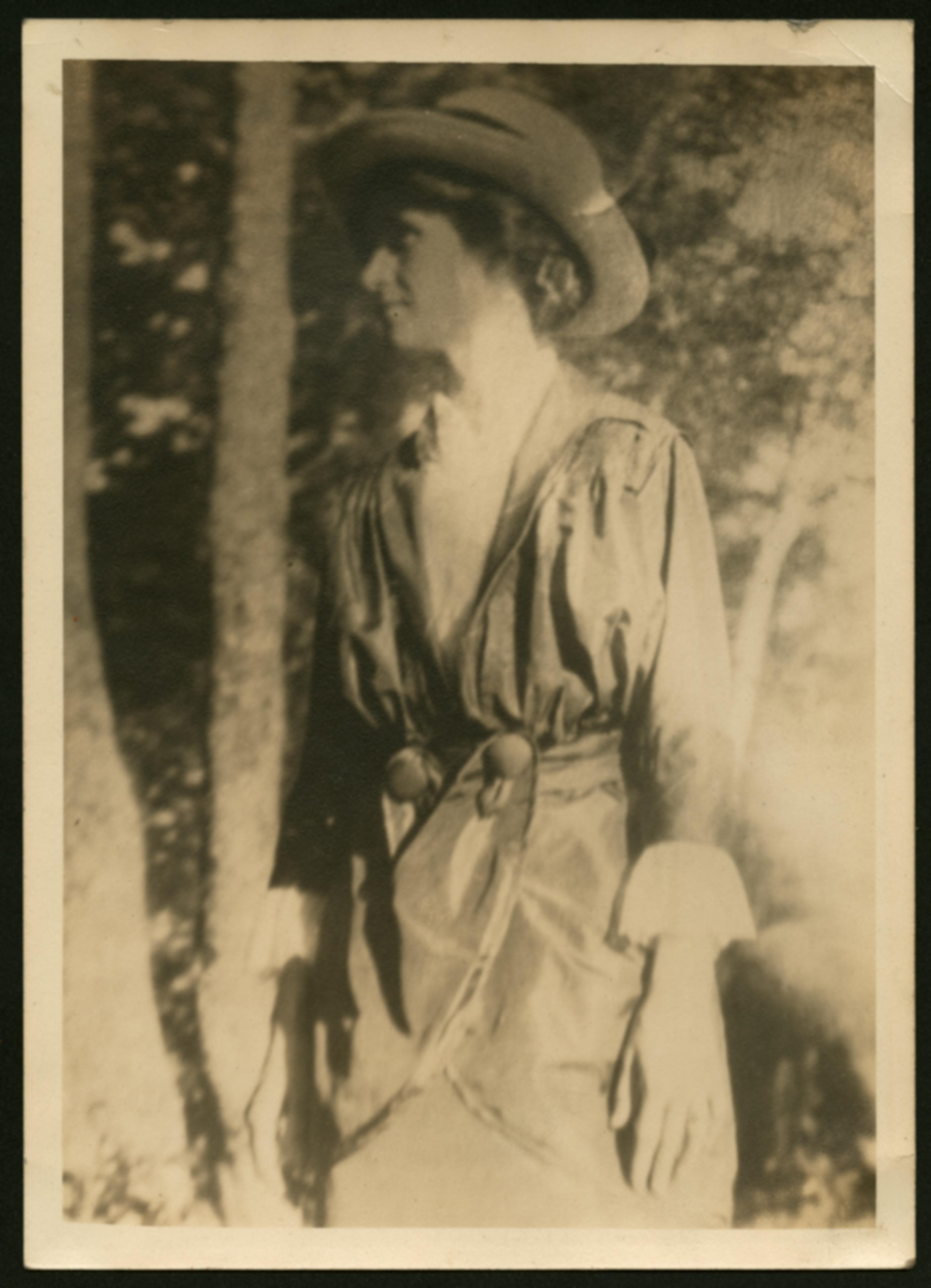 A portrait of an adult in front of some trees and looking away from the camera. Approx 1930; (Undated)