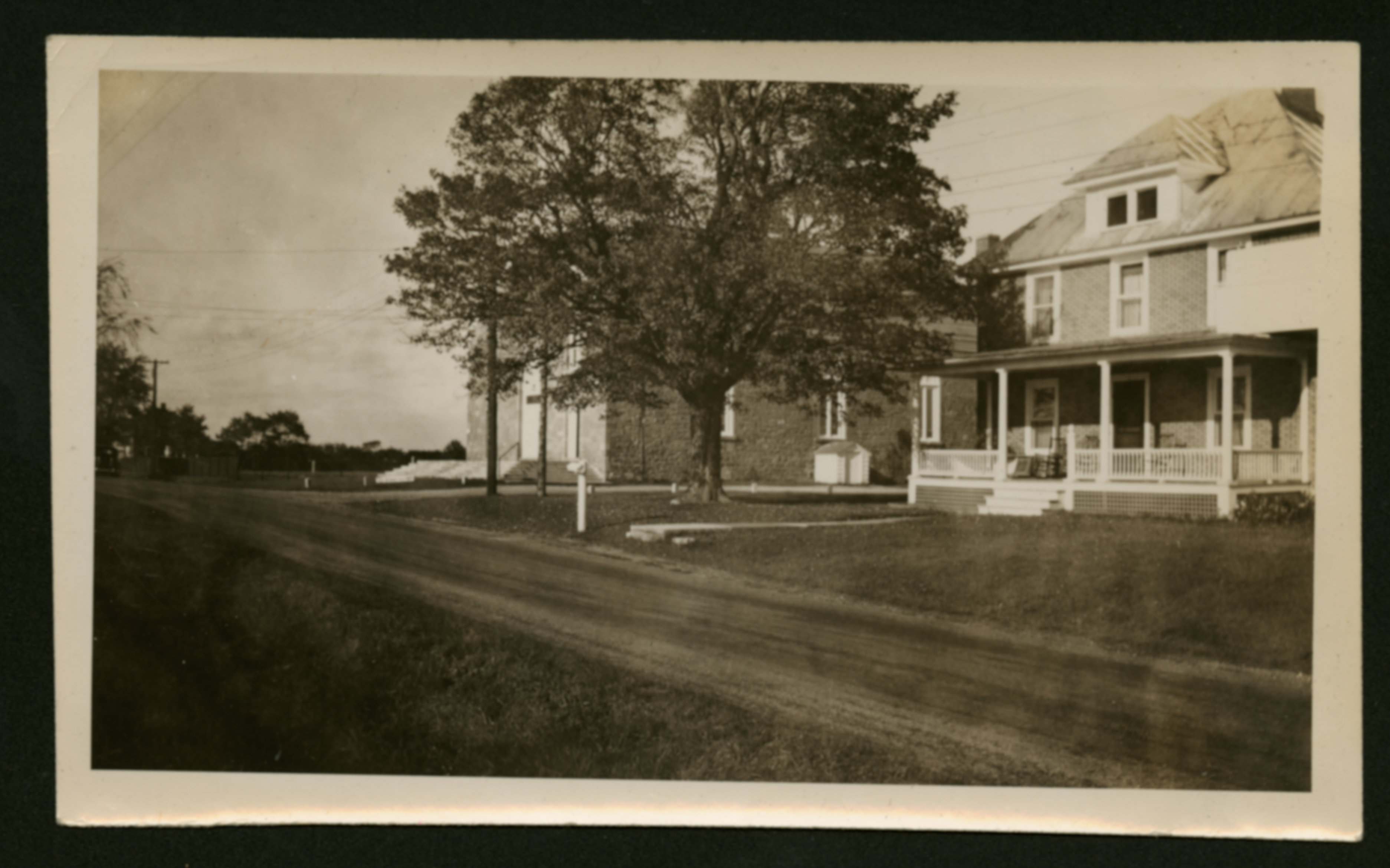 An image of a street showing two houses, with one partially blocked from view by a tree.