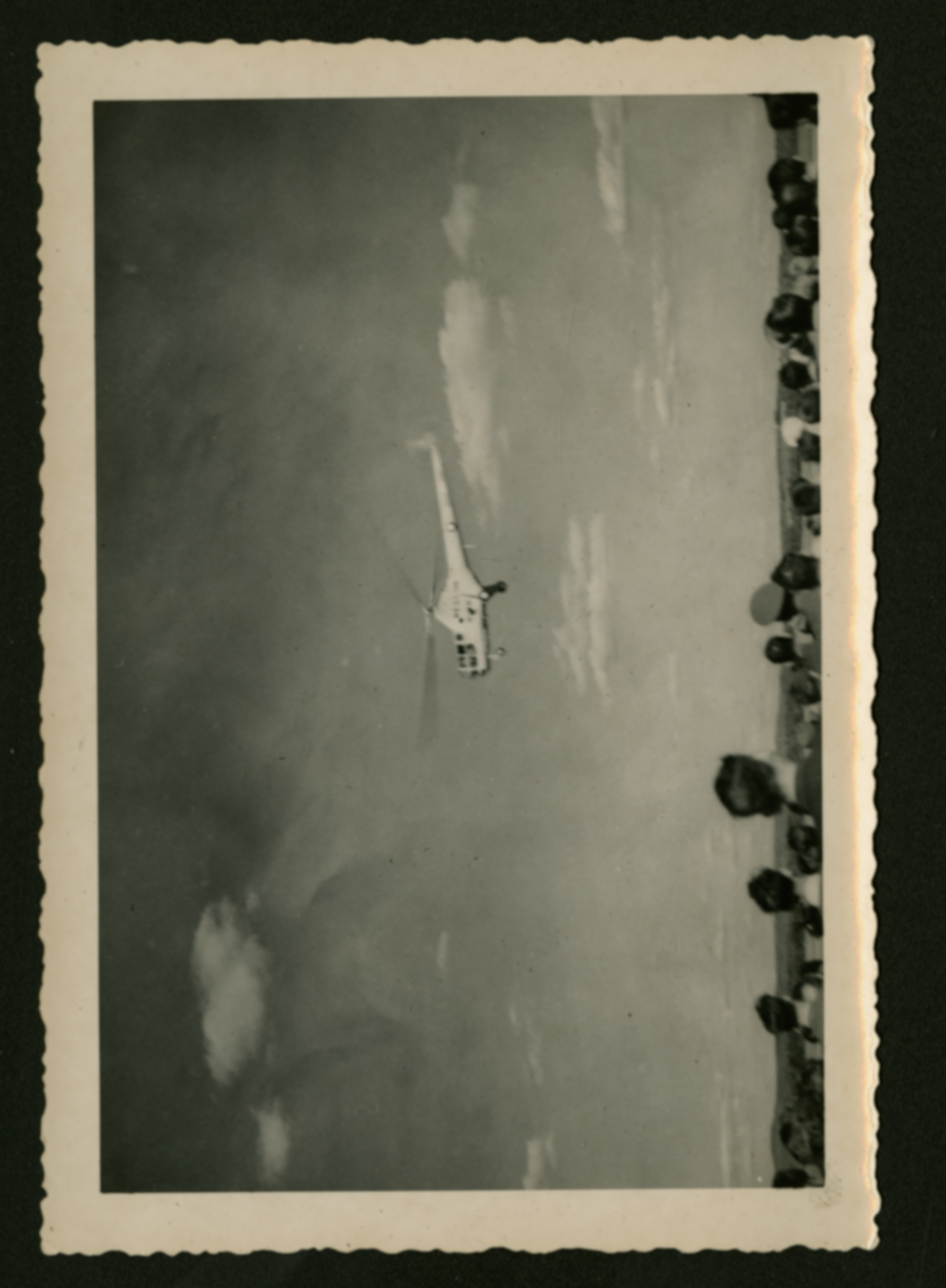 An image showing a 1930s miltary rescue helicopter in the air flying from a distanc; (Undated)