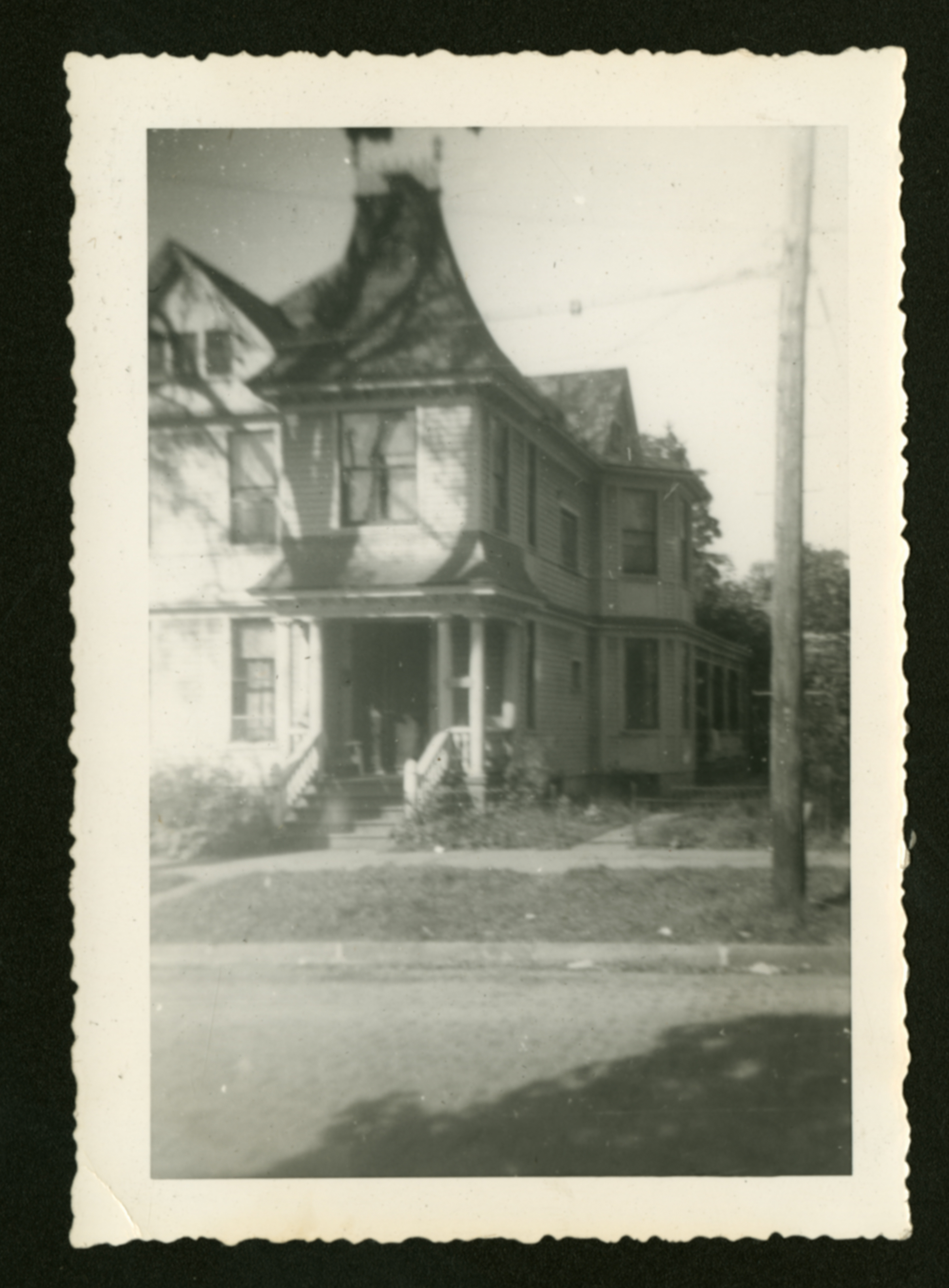 A photo of the front of the house being near a street poll; (Undated)