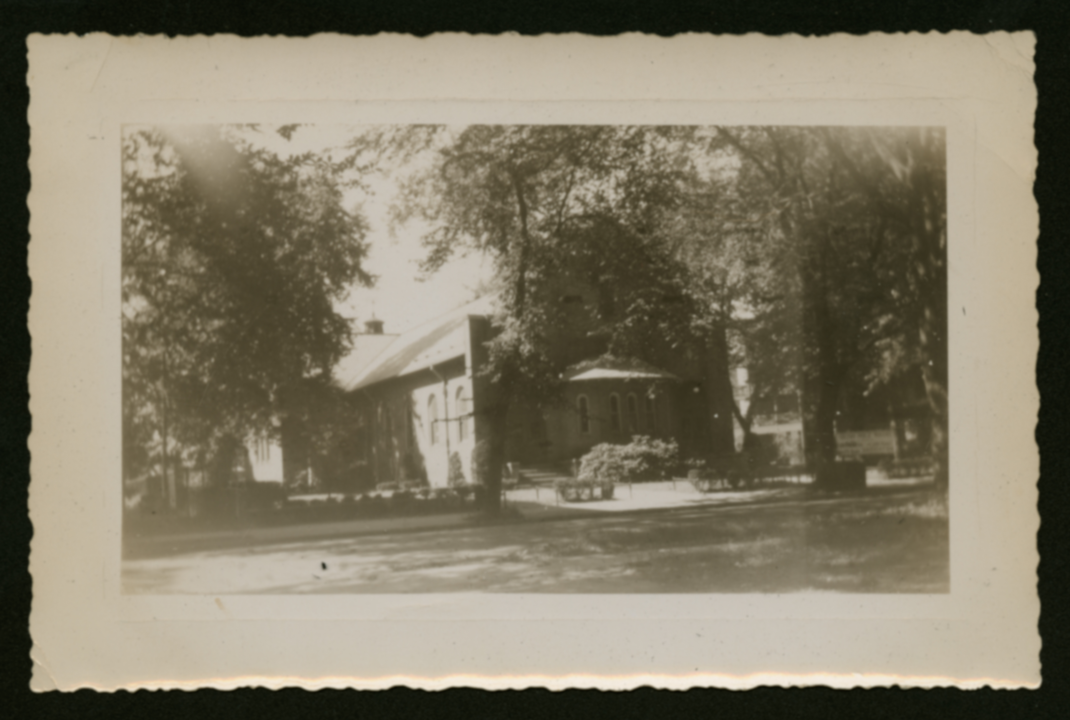 A wideshot of a street with a large building being covered by trees; (Undated)