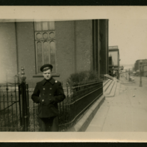 A portrait of an adult dressed in a coat and a US Navy hat, standing on the side of the sidewalk and behind a building staring directly at the camera; (Undated)
