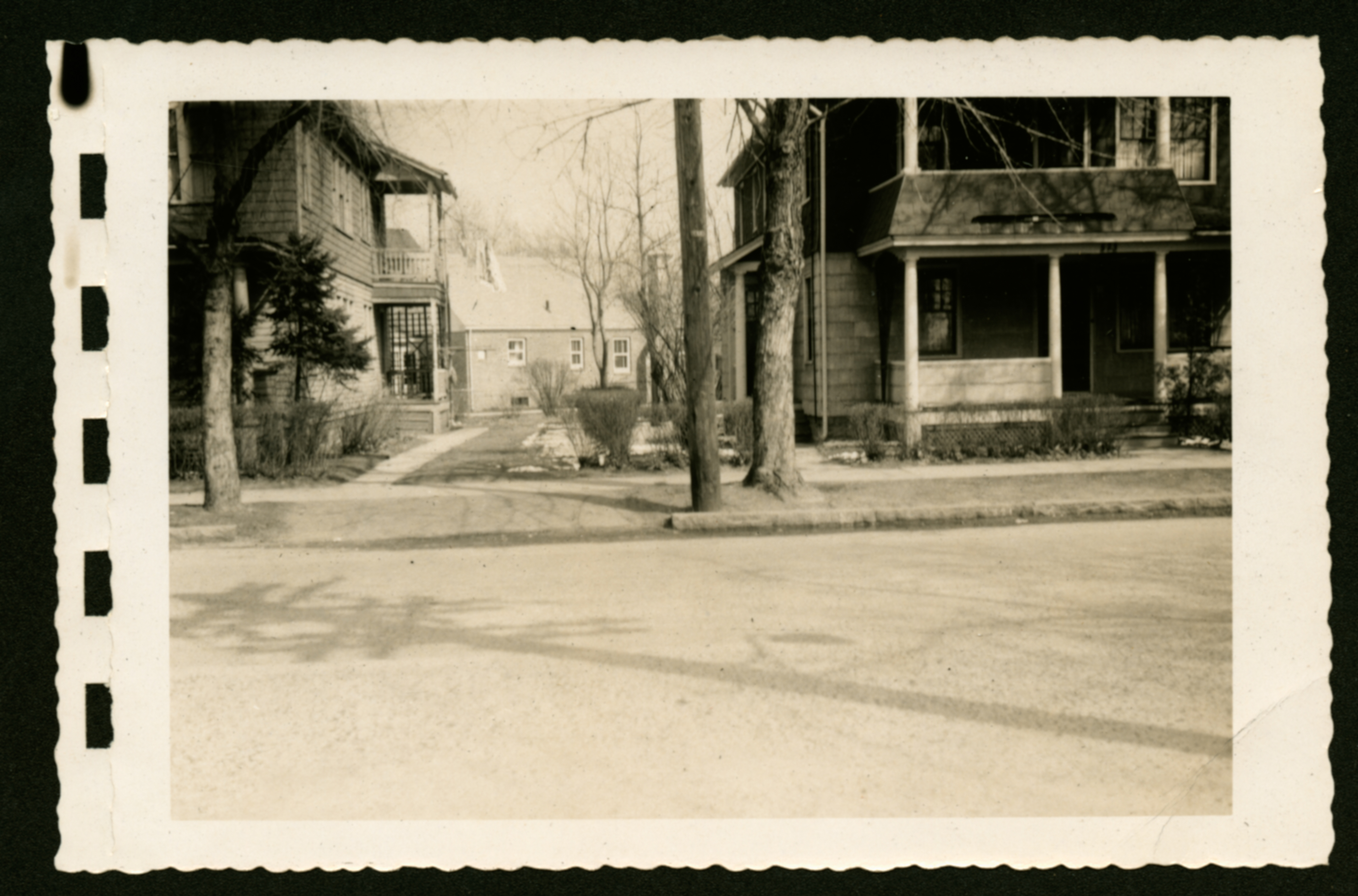A street image showing two houses in between trees and facing the main road. As the shadow of a electric pole illuminates from above.