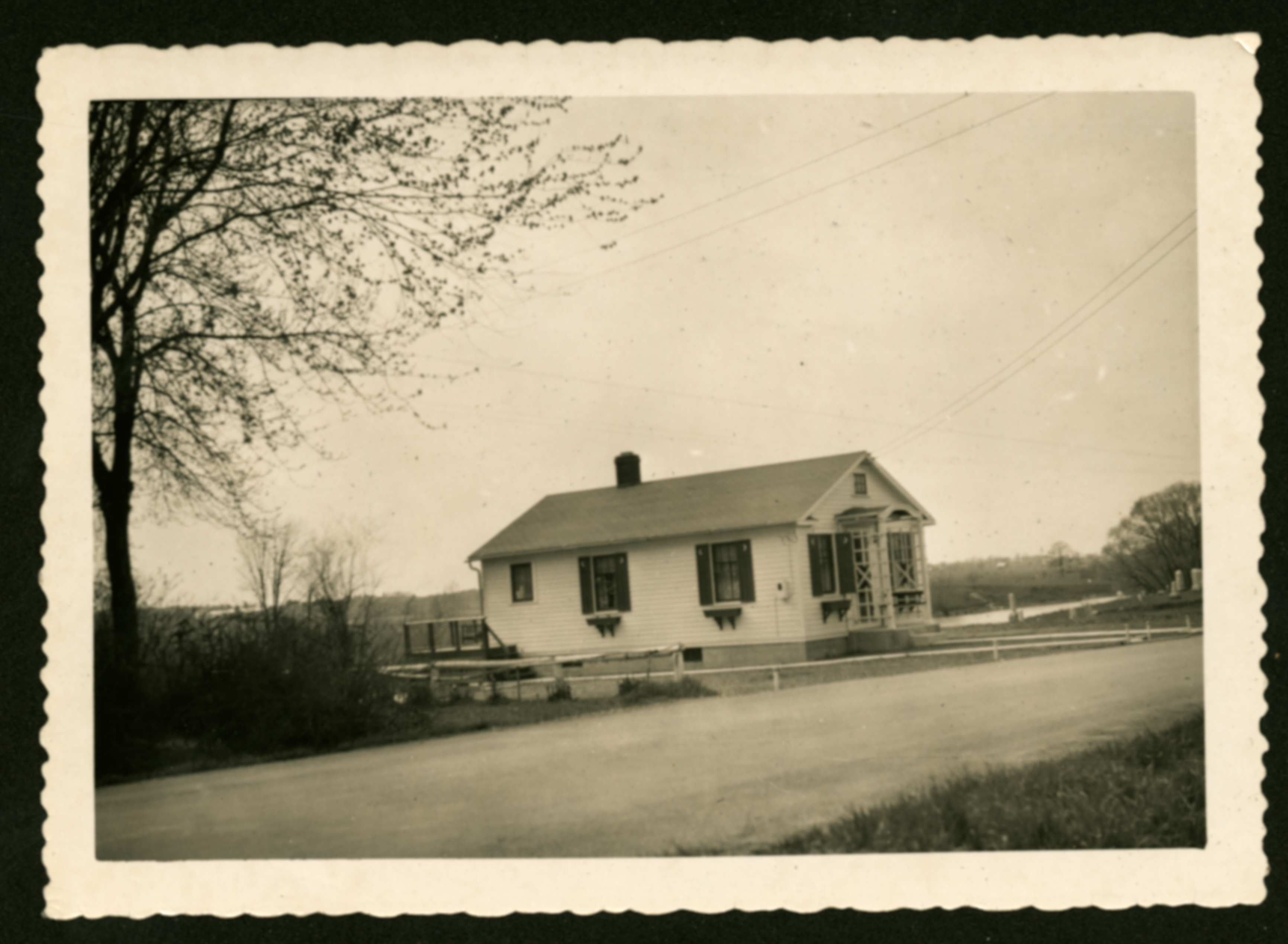 A wideshot of a one floor house in front a dirt road, and in front of a large plot of land; (Undated)