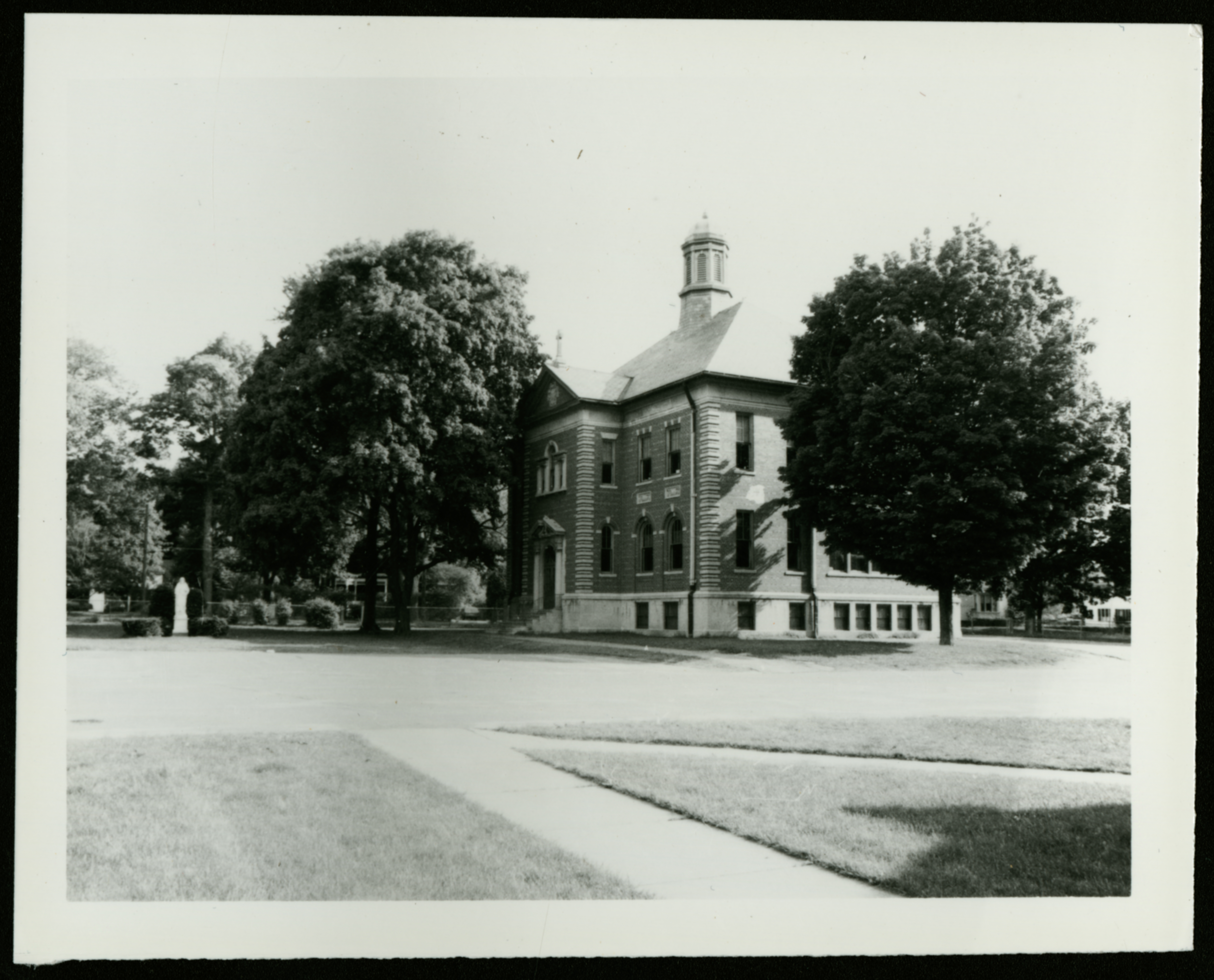 Black and white photograph of a brick building with several trees around it. Image is taken at an angle to the building, showing the corner and two sides. The building was originally the "Science School," and changed to an elementary school in the 1960s/70s. From the MA Historical Commission: "In 1925 a Science building devoted exclusively to domestic, commercial and physical sciences was erected. It is beaux art in style, rich with cast-stone ornamentation. The frontpiece is pedimented with paladian window and open pedimented entrance with classical ornamentation. Today [1978] 3 grammar grades are taught in the building; the Sisters provide an education for grades 1-8 on the site."