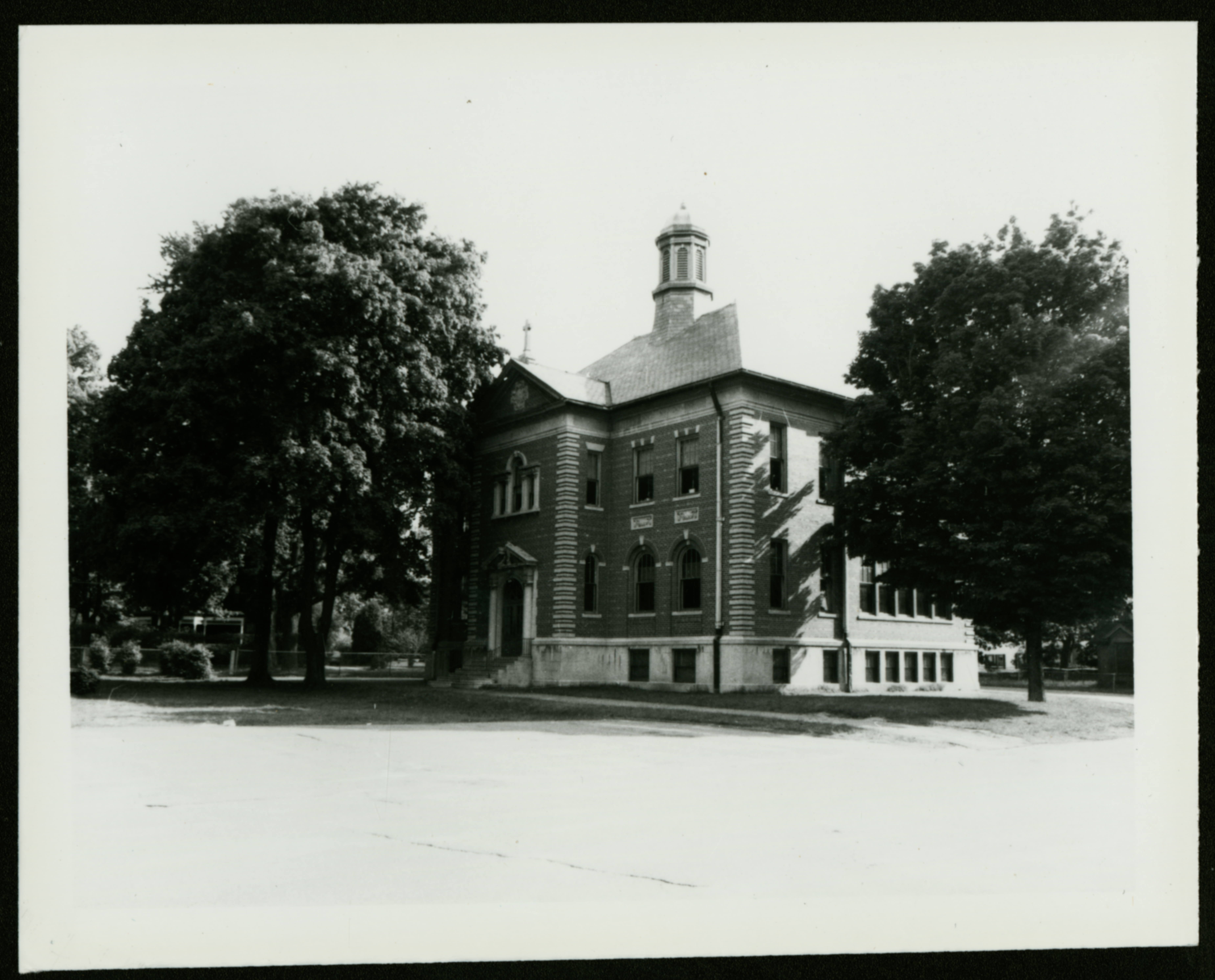Black and white photograph of a brick building with trees around it. Photo is taken from an angle, showing the corner and two sides; building is the same as CPL-Morrow-001.