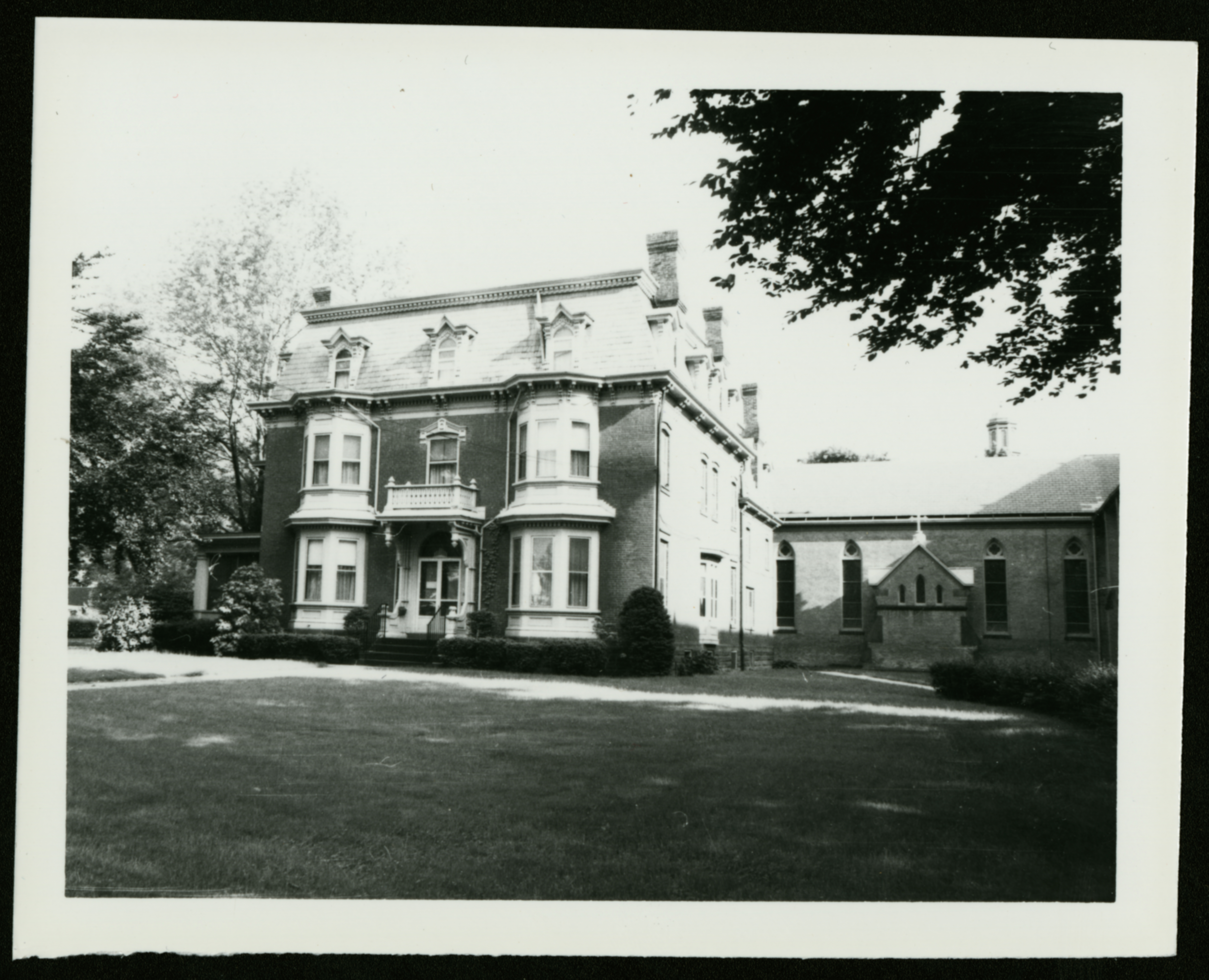 Black and white photograph of a brick building with several chimneys and bay windows. As described by the MA Historical Commission: "The presbytery, also constructed 1857-1859, is located on the east of the Church on South Street. It is a 3 story brick structure set on a sandstone foundation. Originally hip-roofed, in 1871 the roof was raised and a story added mansard style. The building is rich with wood detailing, eaves are bracketed and punctuated with dentils. Dormer windows are topped with decorative, pointed pediments. The front facade features two double-story bays and an elaborate porticoed entrance added in 1871. There is an etched glass fan window over the door."