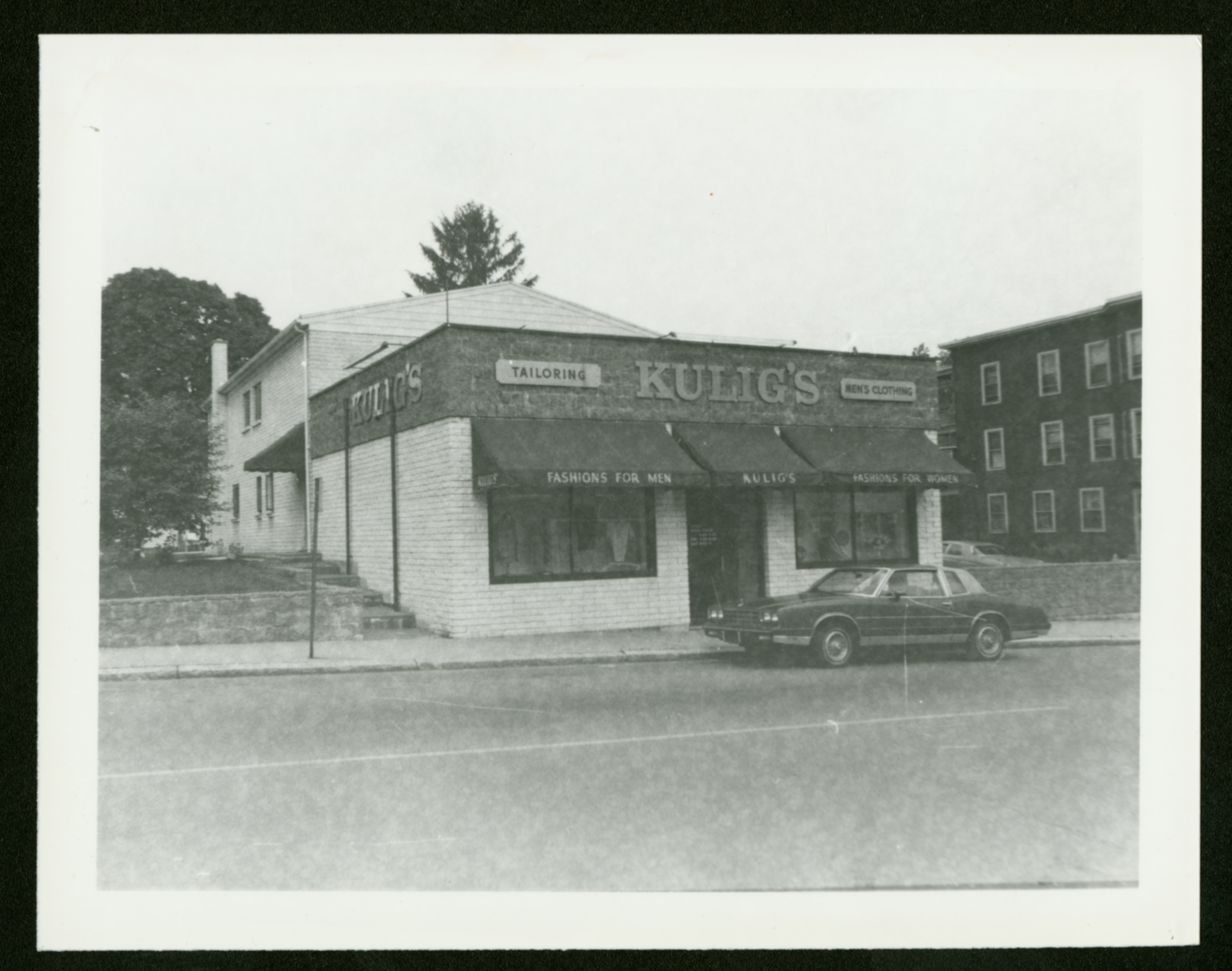 A black and white photograph of the front of Kulig's, a clothing and tailoring store on the corner of Front and Spring Streets in Chicopee. There is a car parked in front of the shop.
