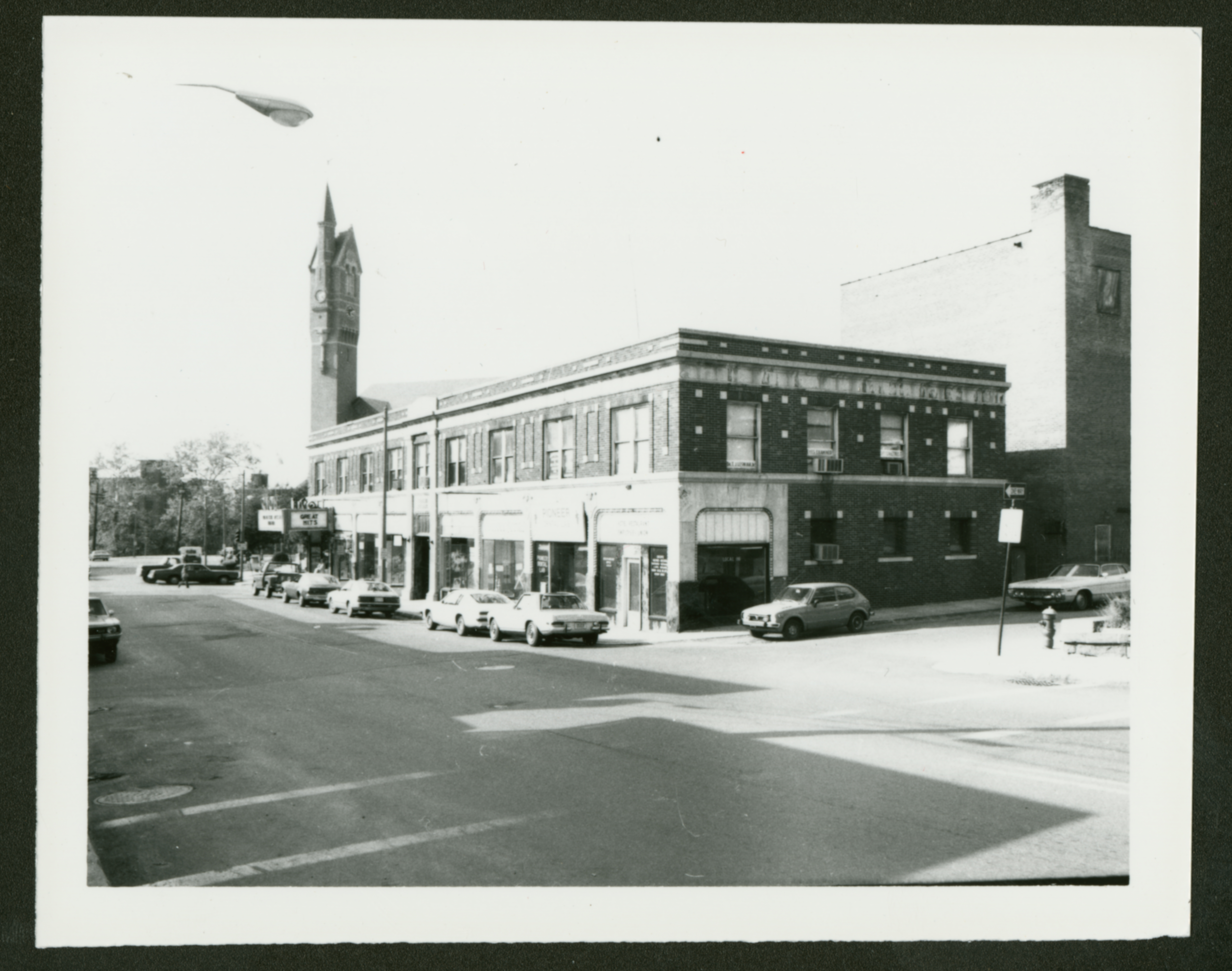 A black and white photograph of The Elms Building, located on Springfield St in Chicopee near the Springfield & Front Street intersection. Several cars are parked along the street, and Chicopee City Hall's clock tower can be seen behind the Elms.