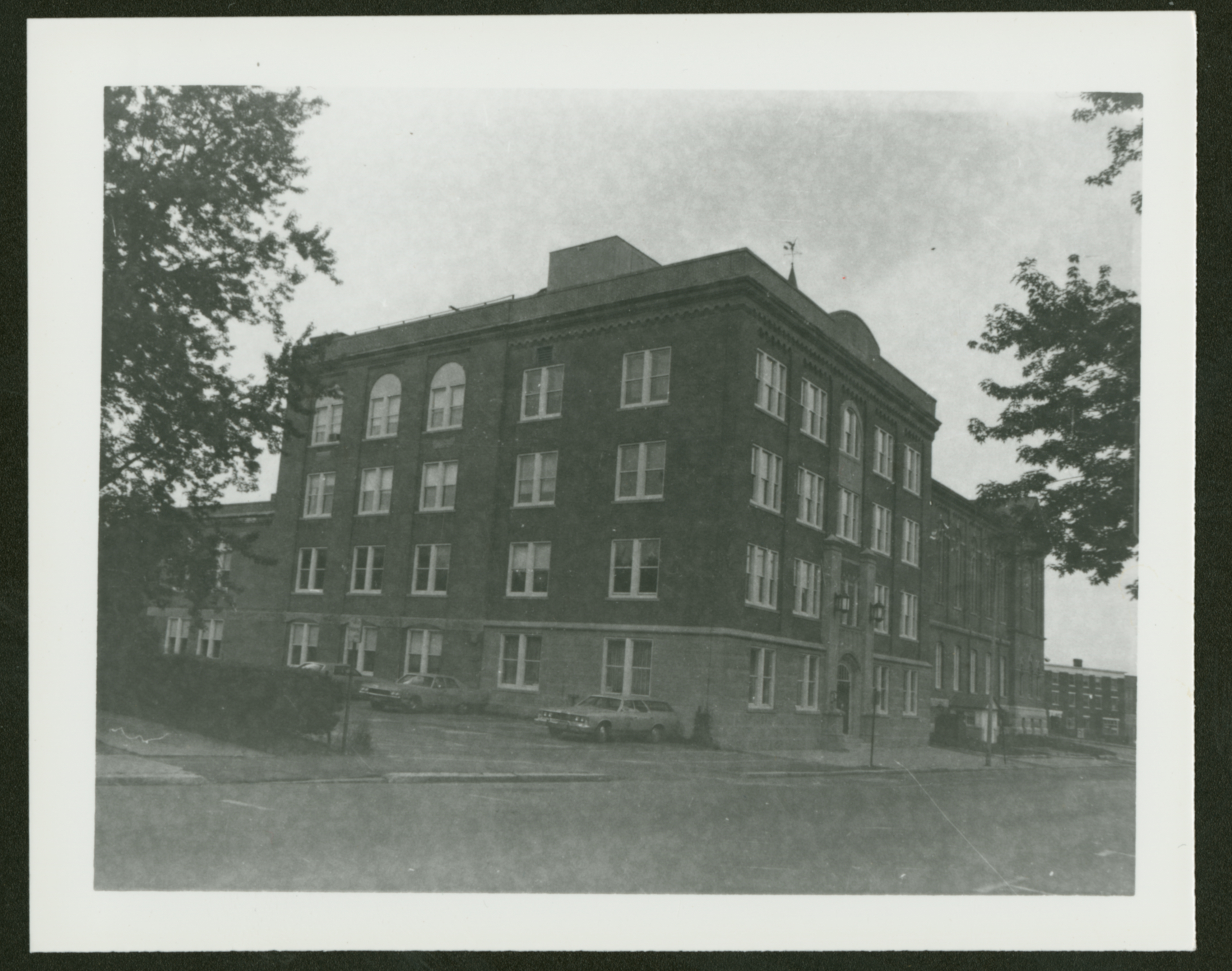 A black and white photograph of a four-story brick building and an adjacent parking lot with a few cars in it. This is a view of City Hall & the City Hall Annex from Front Street, before the addition of an accessibility ramp.