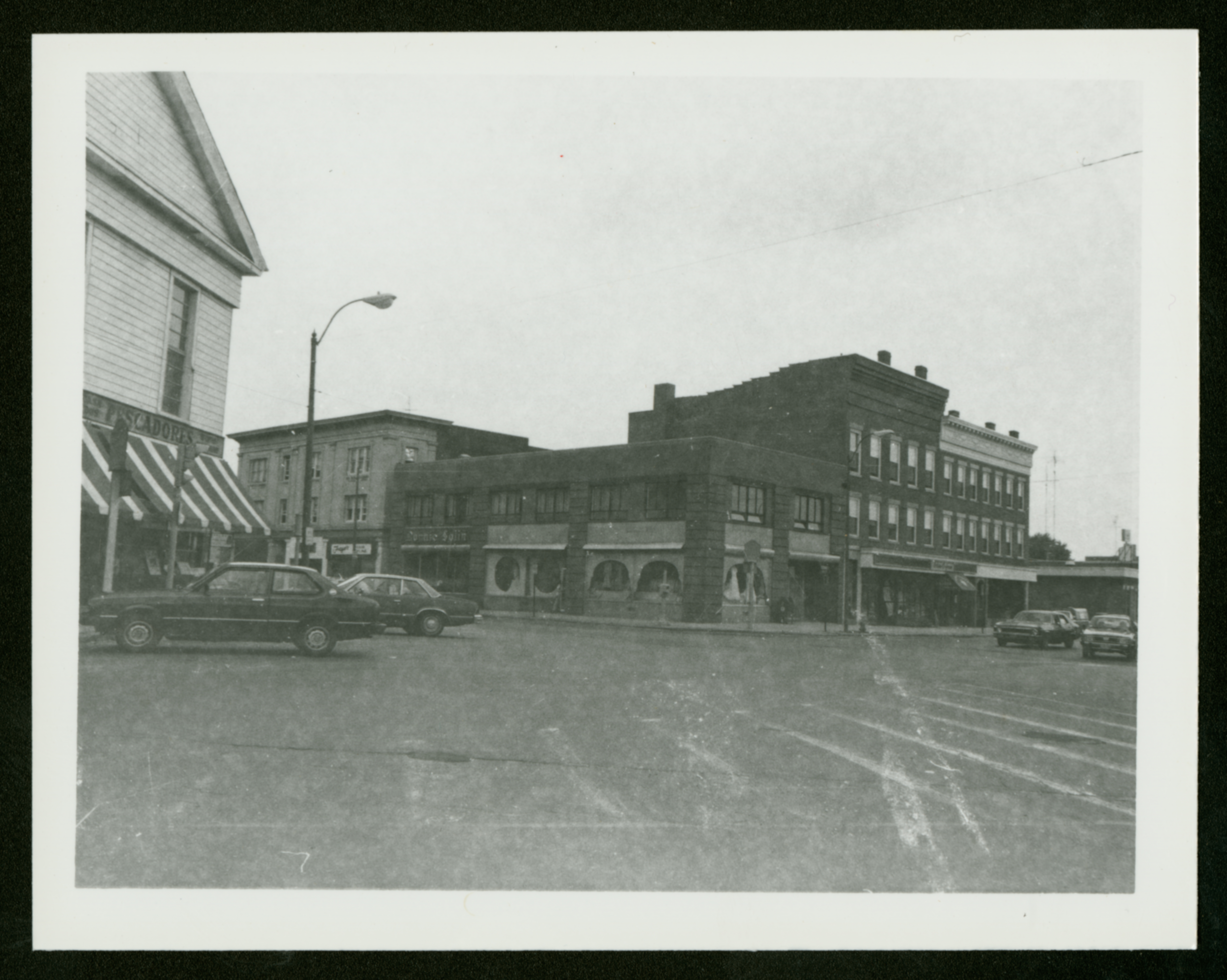 A black and white photograph of several interconnected brick buildings on a street corner. The buildings are on the corner of Exchange and Center Streets in Chicopee. There are several storefronts, some with awnings, and a few cars parked along the road.