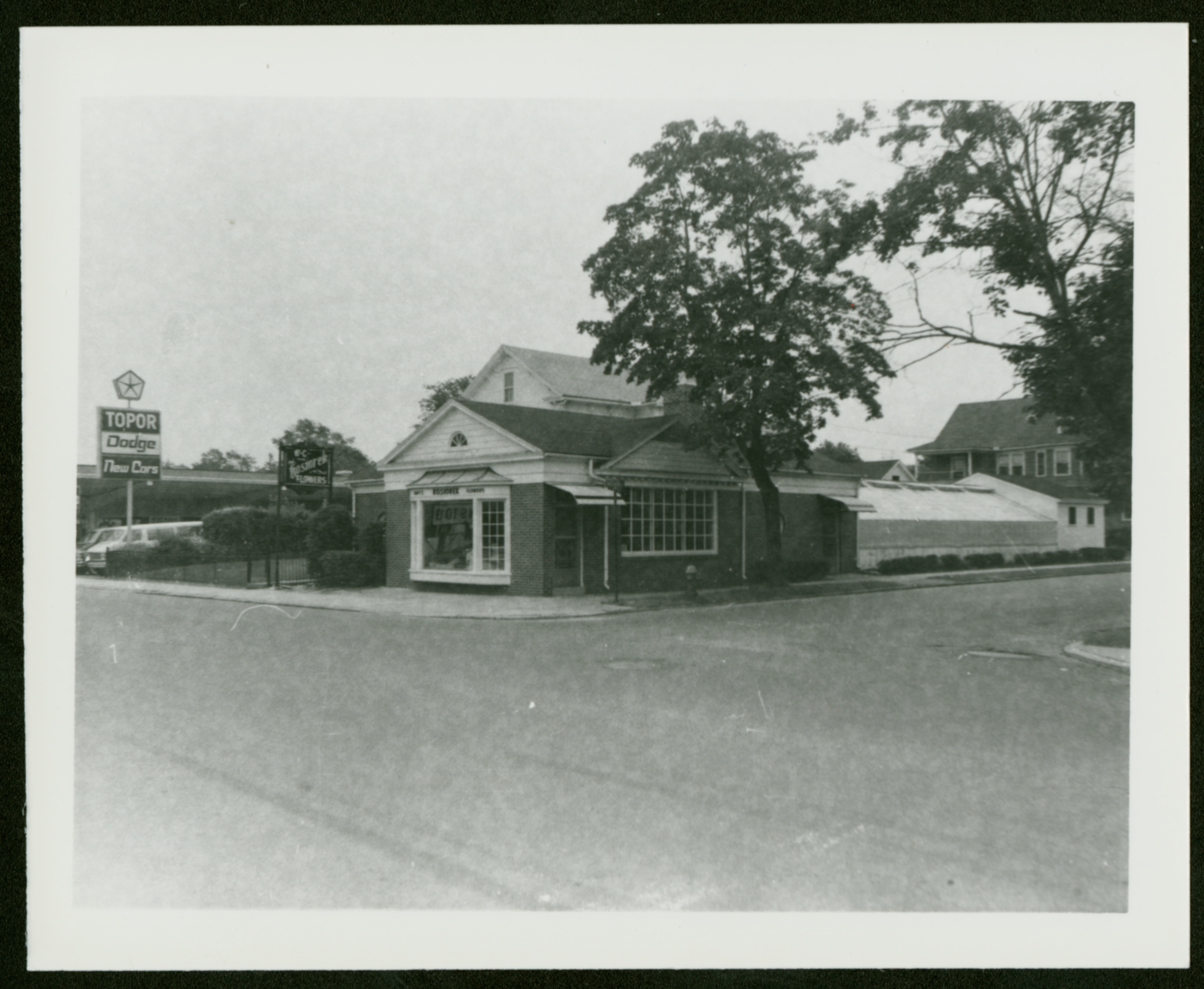 A black and white photograph of a business on a street corner, with a sign identifying it as W.C. Kosiorek Flowers. The building has a small greenhouse attached to it, and a tree and several shrubs in front. In the background is the Topor Dodge dealership. Though not identified in the image, this is at the corner of Orchard and Front Streets in Chicopee.