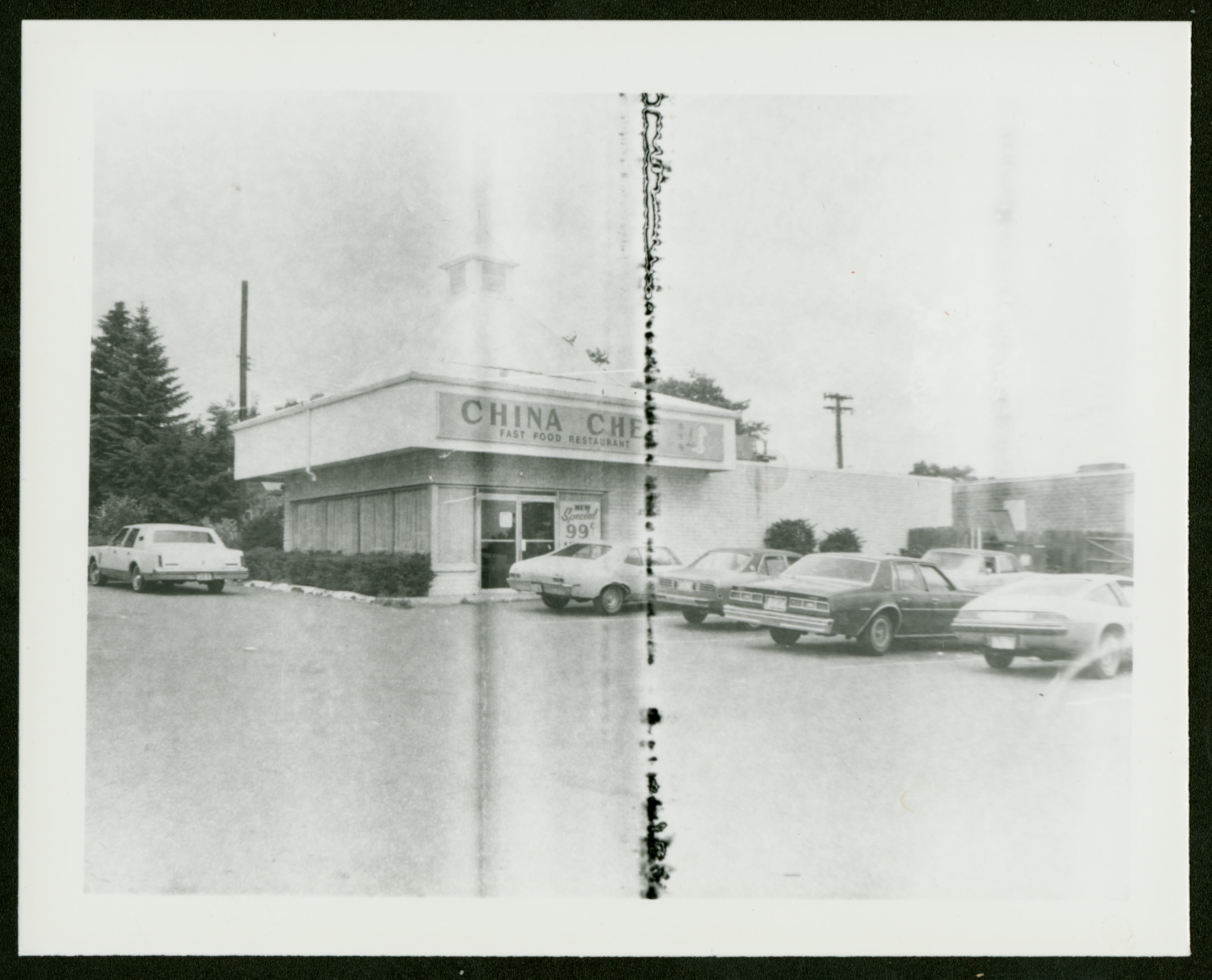 A black and white image, with a vertical line through it [likely damage to the photo negative that came through when it was developed] showing China Chef Fast Food Restaurant, with several cars parked in the attached parking lot.