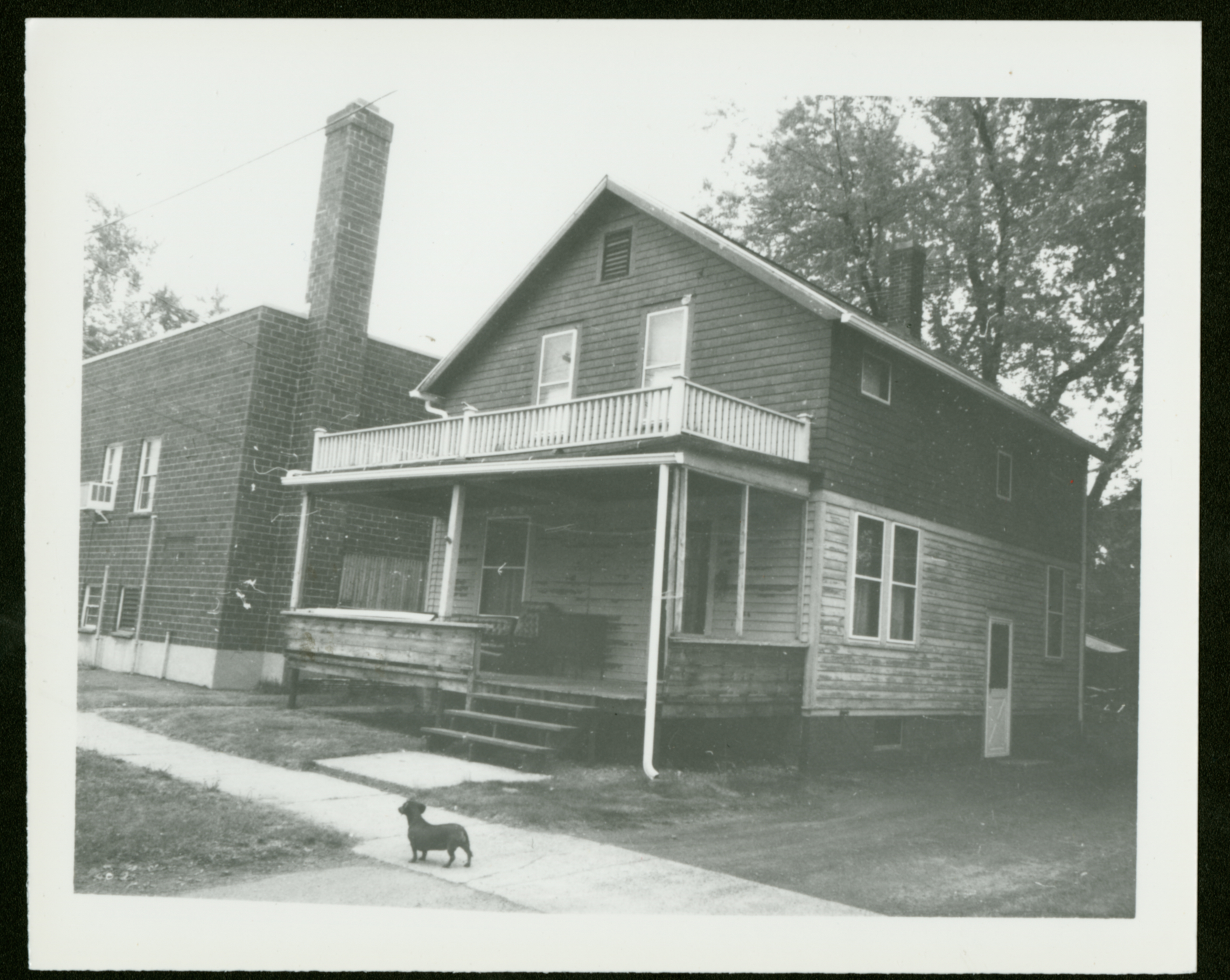 A black and white photograph of a two-story home next to a story-and-a-half brick building. On the sidewalk in front of the home is a daschund, who is most assuredly a very good pup.