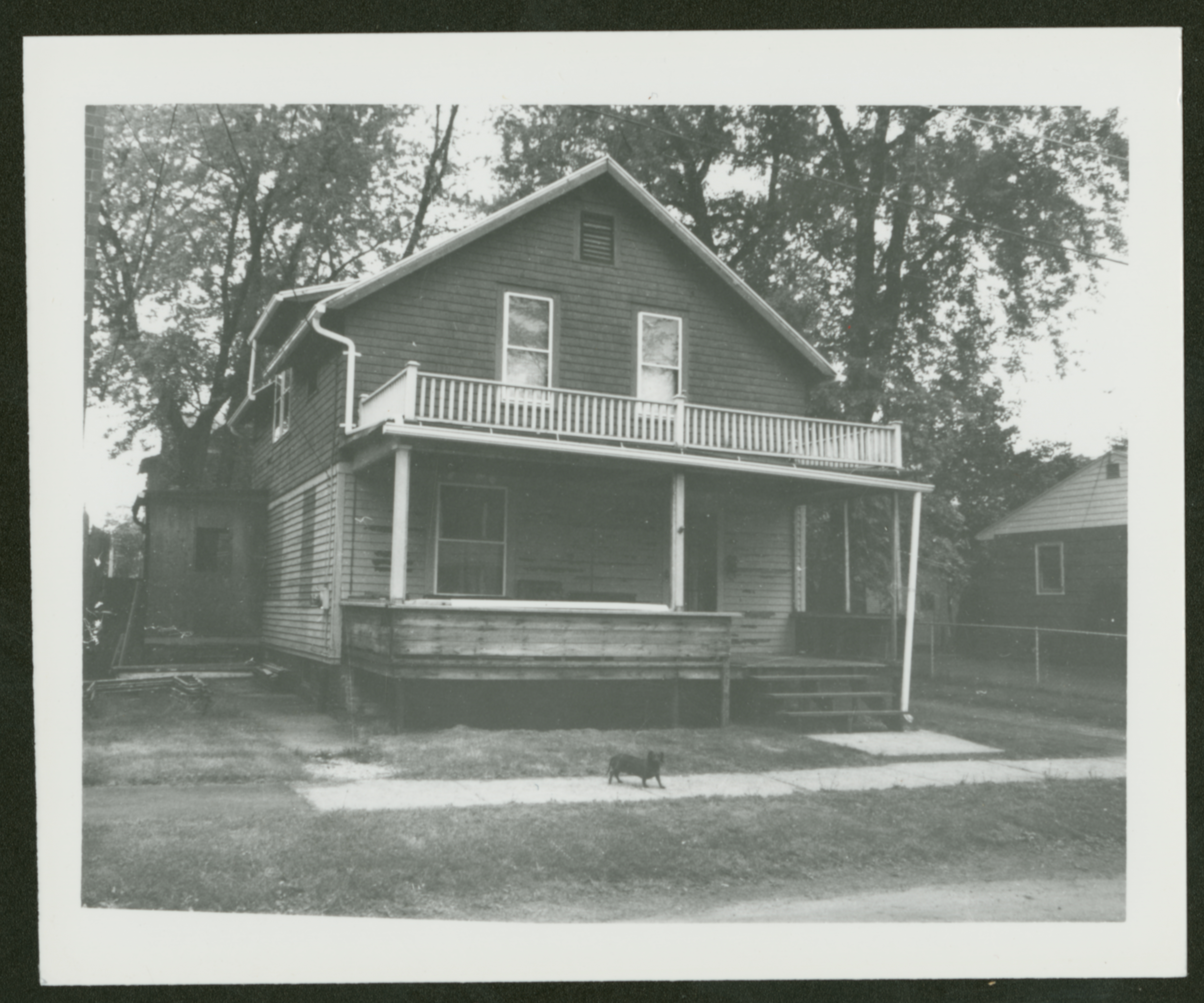A black and white photograph of a two-story home (the same home pictured in CPL-Morrow-030) with a daschund on the sidewalk in front of the home. The house has a wide front porch, and what might be an addition or enclosed porch is visible on the side of the house. The daschund, looking at the camera, is a very good dog.