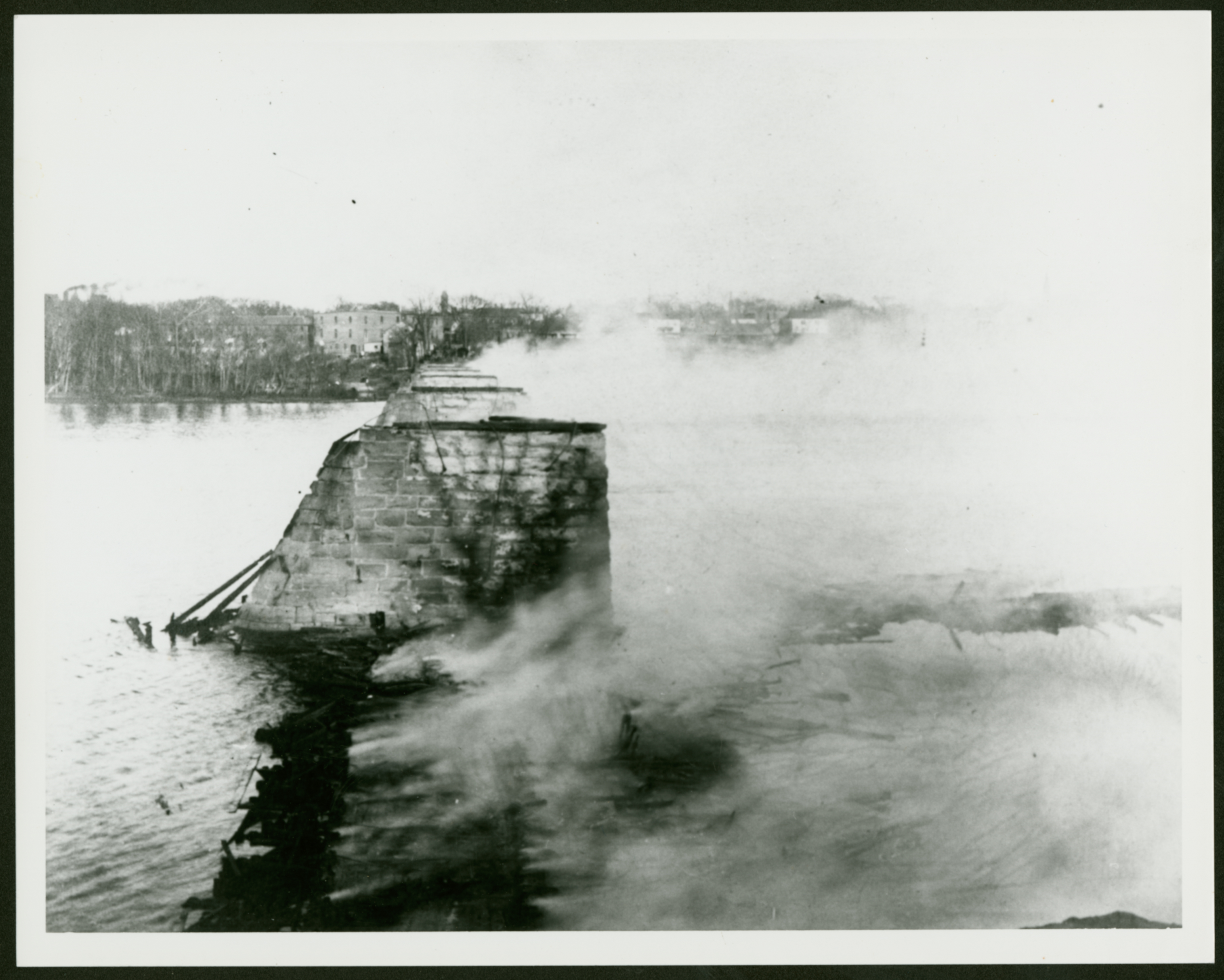 A black and white photograph of brick bridge piles lined up across a river, with houses in the background. There is smoke or fog in the right side of the image; given that the piles are for the Chicopee River Bridge that connected West Springfield to Chicopee and burned in 1903, this might be an image of the immediate aftermath of the fire.