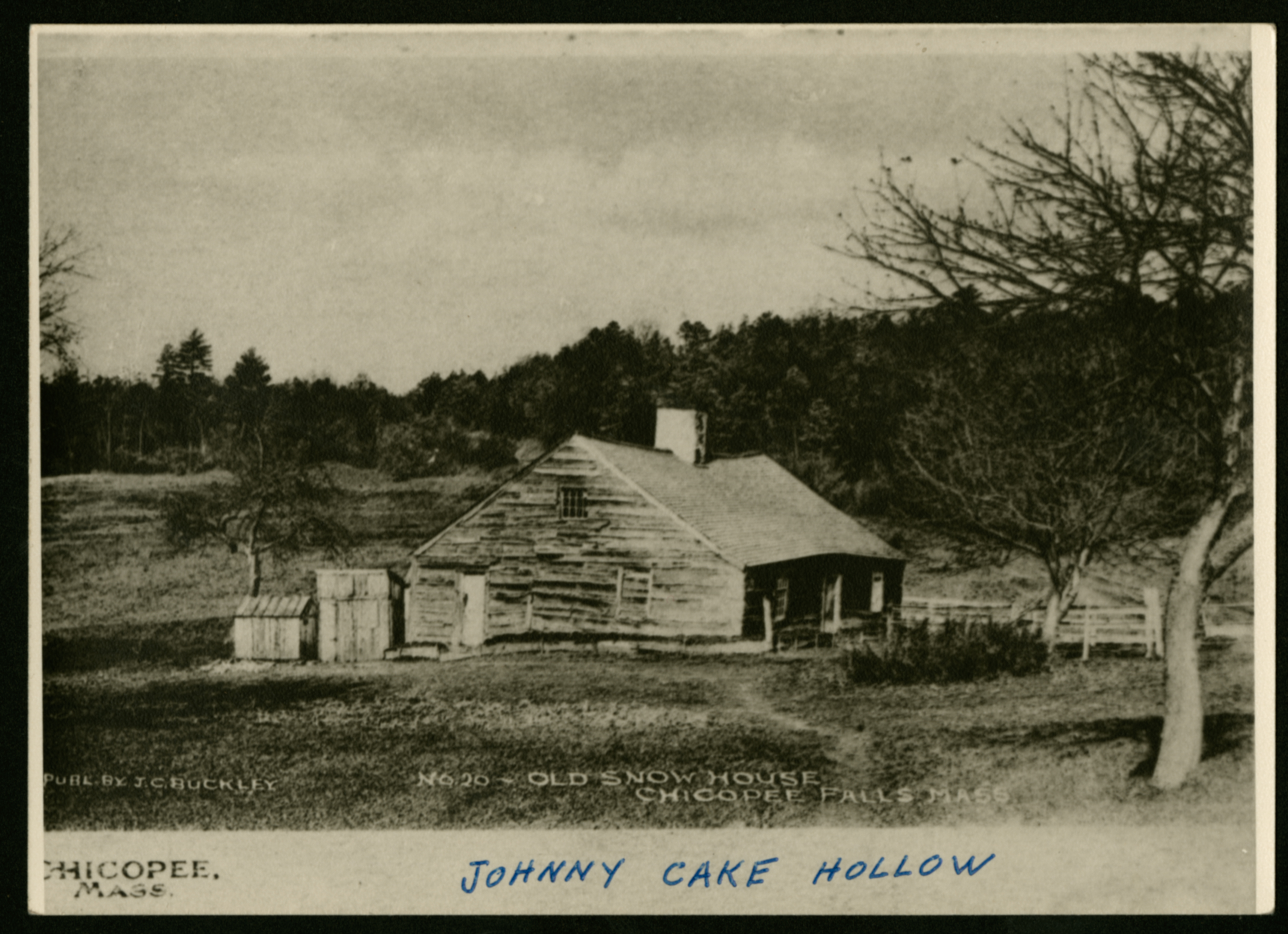 A black and white image (likely a copied postcard) of a small cabin with two very small outbuildings and several trees. Printed on the original image is "Publ. by J.C. Buckley, No. 20--Old Snow House, Chicopee Falls, Mass." Handwritten on the image is "Johnny Cake Hollow."