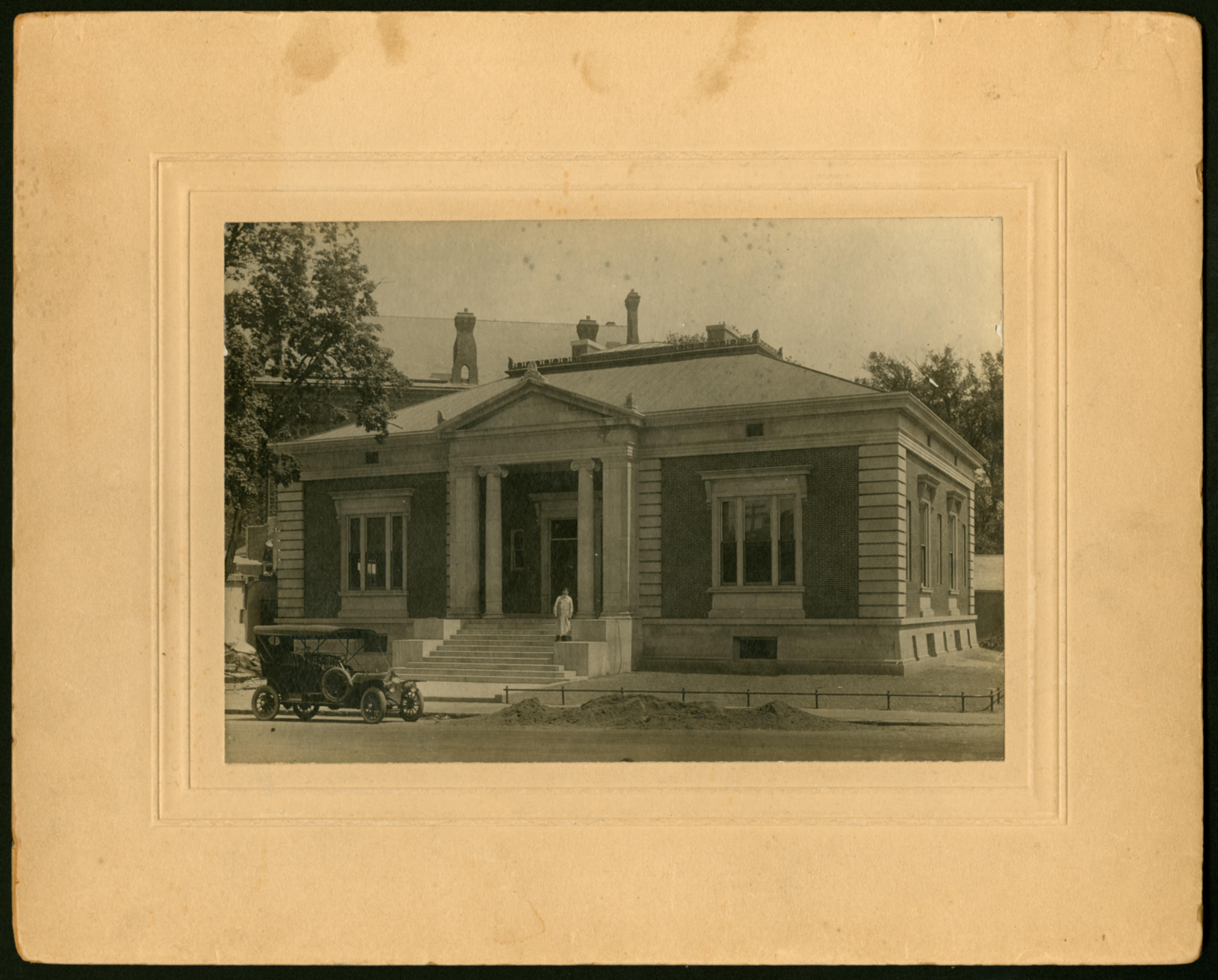 A black and white photograph mounted on ivory cardstock of the "old" Chicopee Public Library at Market Square. This is likely the original photograph that appears in CPL-HistMisc-003, as it is mounted in the style of early 20th-century photography. As described by the MA Historical Commission: "Located on a rectangular lot adjoining the City Hall, and facing Market Square, the Chicopee Public Library is a Classical Revival building constructed of red pressed brick with trimmings of white granite. It rises two levels from a rusticated stone basement to a low hip roof which is covered with sheet copper. Its main facade is dominated by a recessed, ionic columned (in antis) and pedimented entrance. A broad flight of stone stairs leads to the entrance, which in turn is flanked by tall, fully enframed and console bracketed, tripartite windows. Its corners are accented with large quoins and it is encircled by heavy, classicized stone cornice." There is a man standing on the steps who appears to be a workman, wearing a long white garment that suggests he is a painter. There is a car parked in front of the building, and a dirt pile that suggests this was taken during construction.