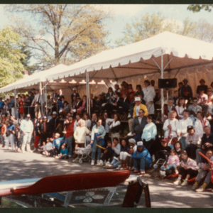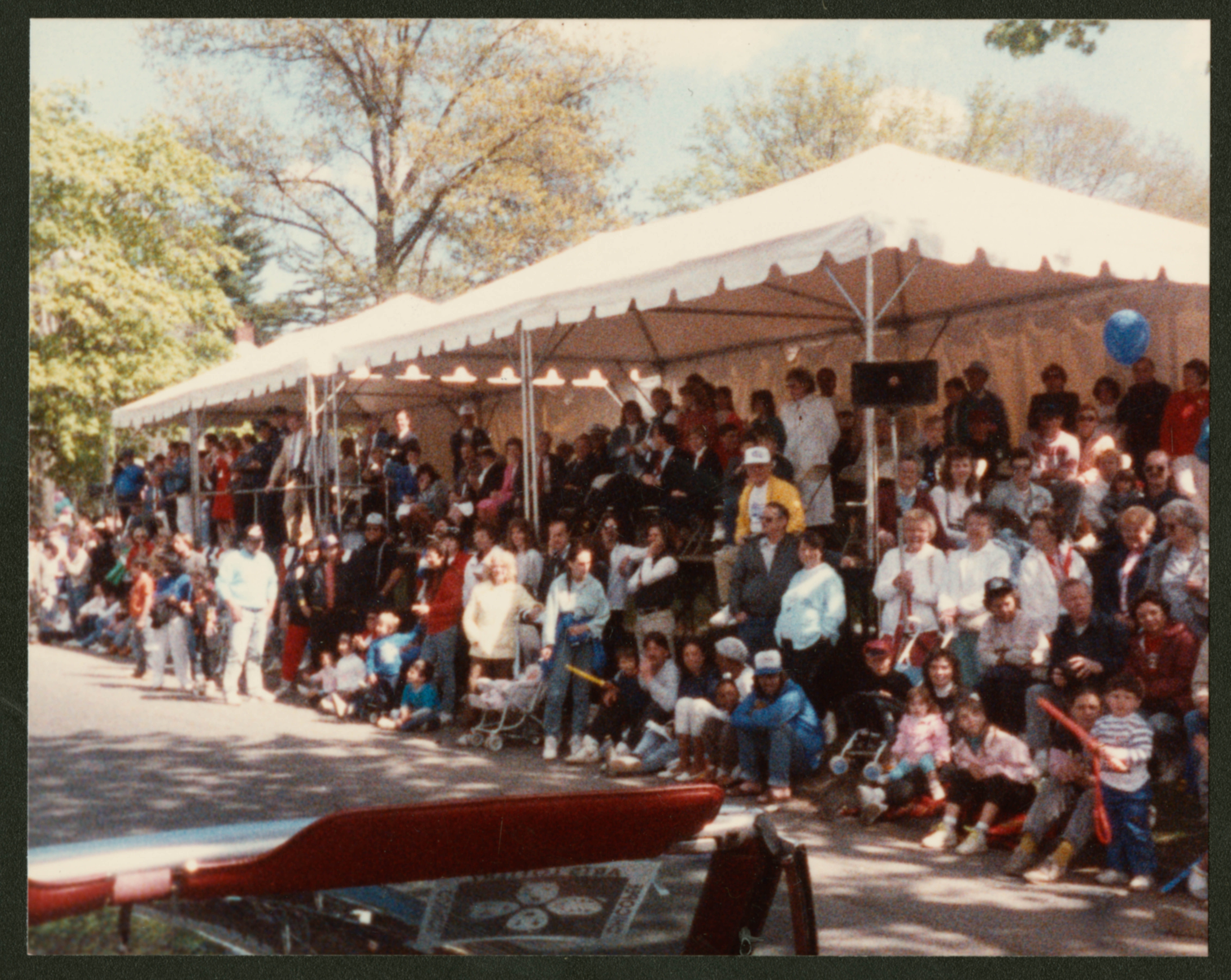 Color photograph of a crowd of people gathered underneath a white tent along the edge of a road. The top of a car windshield is visible in the lower part of the image, suggesting it was taken from a car in the parade.