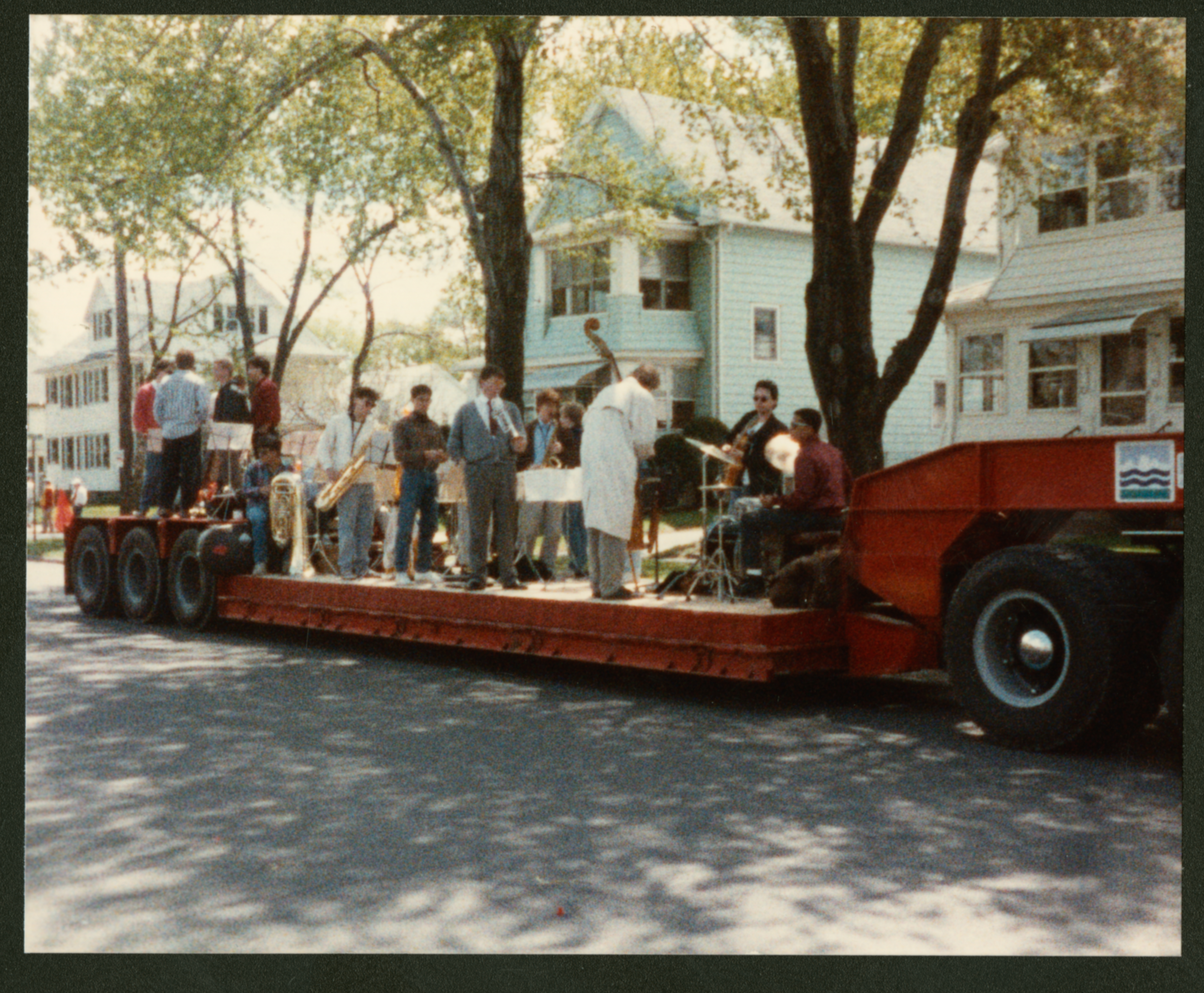 A color photograph of an undecorated red flatbed trailer with a band playing. There is a bass cello, a drumset, and several brass instruments, but the band is not identified.