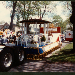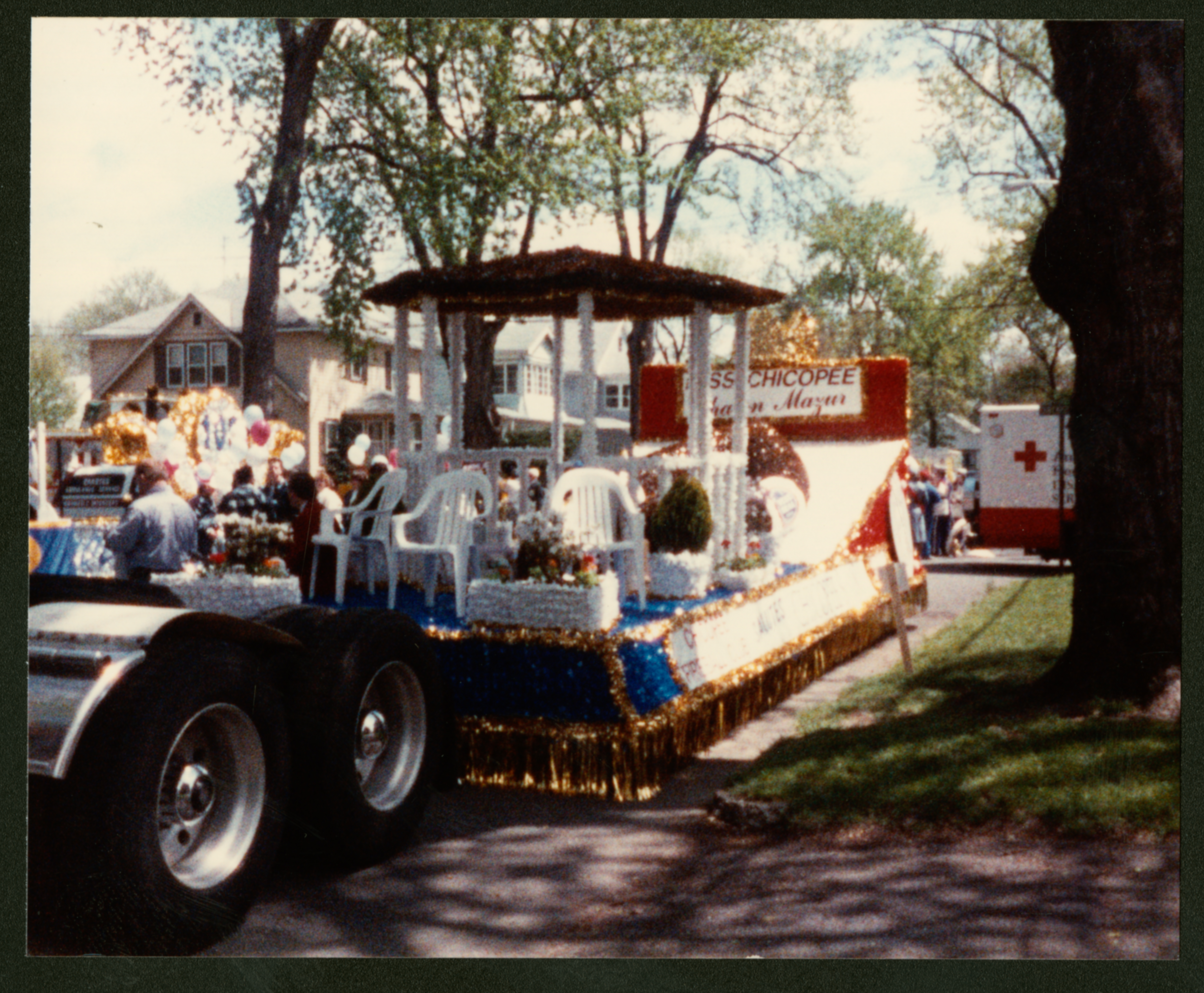 A color photograph of parade floats in what looks like a staging area. The float primarily featured is decorated in white, gold, and blue, and reads "MIss Chicopee" on the back board. The name below it is partially obscured, but the last name is "Mazur." There are several empty white chairs on the float, as well as a gazebo.