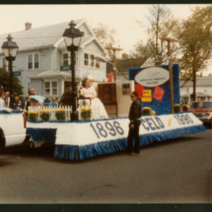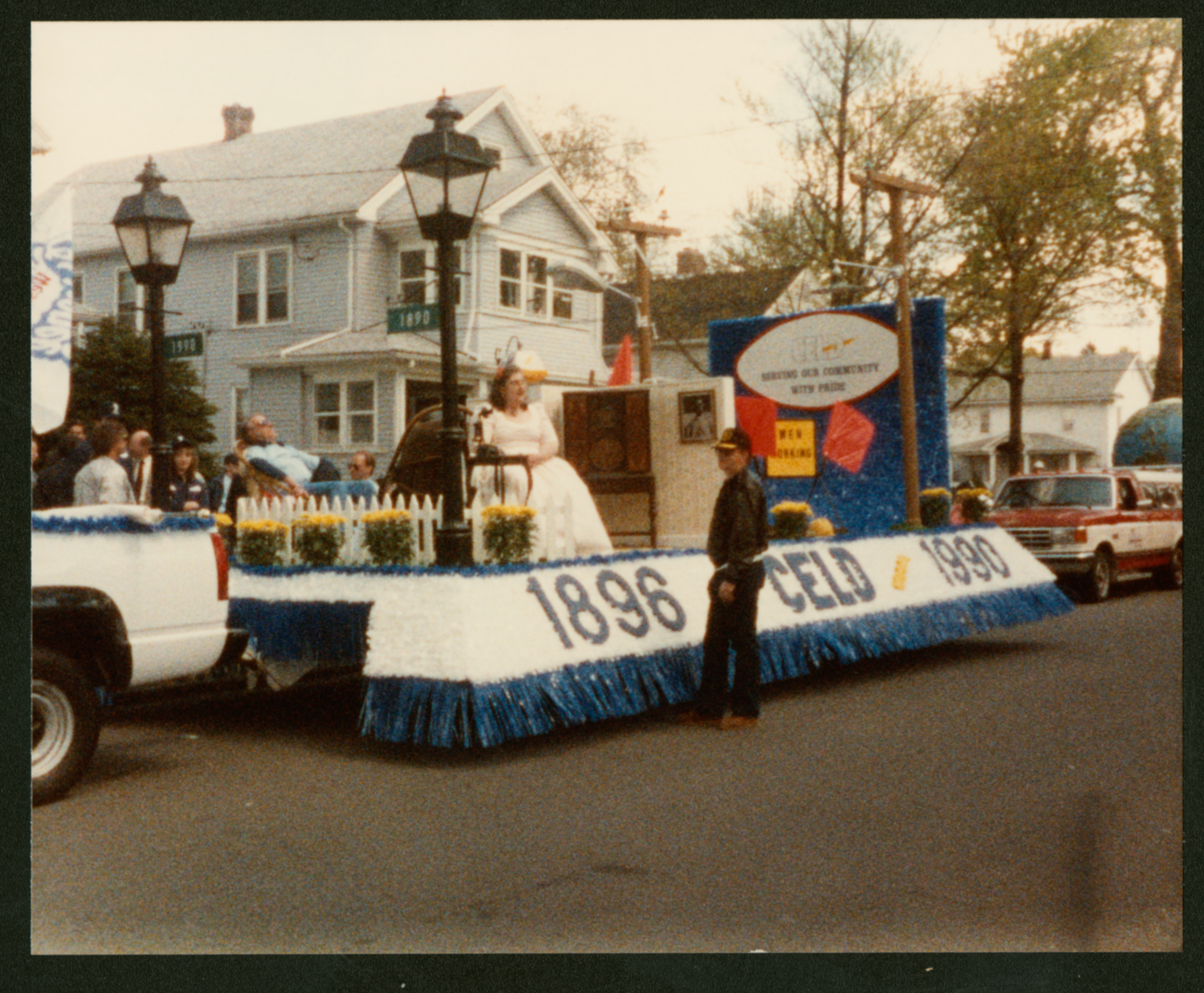 A color photograph of a float decorated with lampposts, telephone poles, and some construction flags. A woman wearing an old-fashioned white dress sits on the float. A sign reads "CELD Serving Our Community with Pride," and the side of the float reads "1890 CELD 1990." A man stands next to the float, which is being pulled by a white truck. Though it is not spelled out, CELD likely stands for Chicopee Electric Light Department.