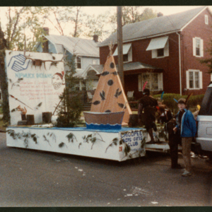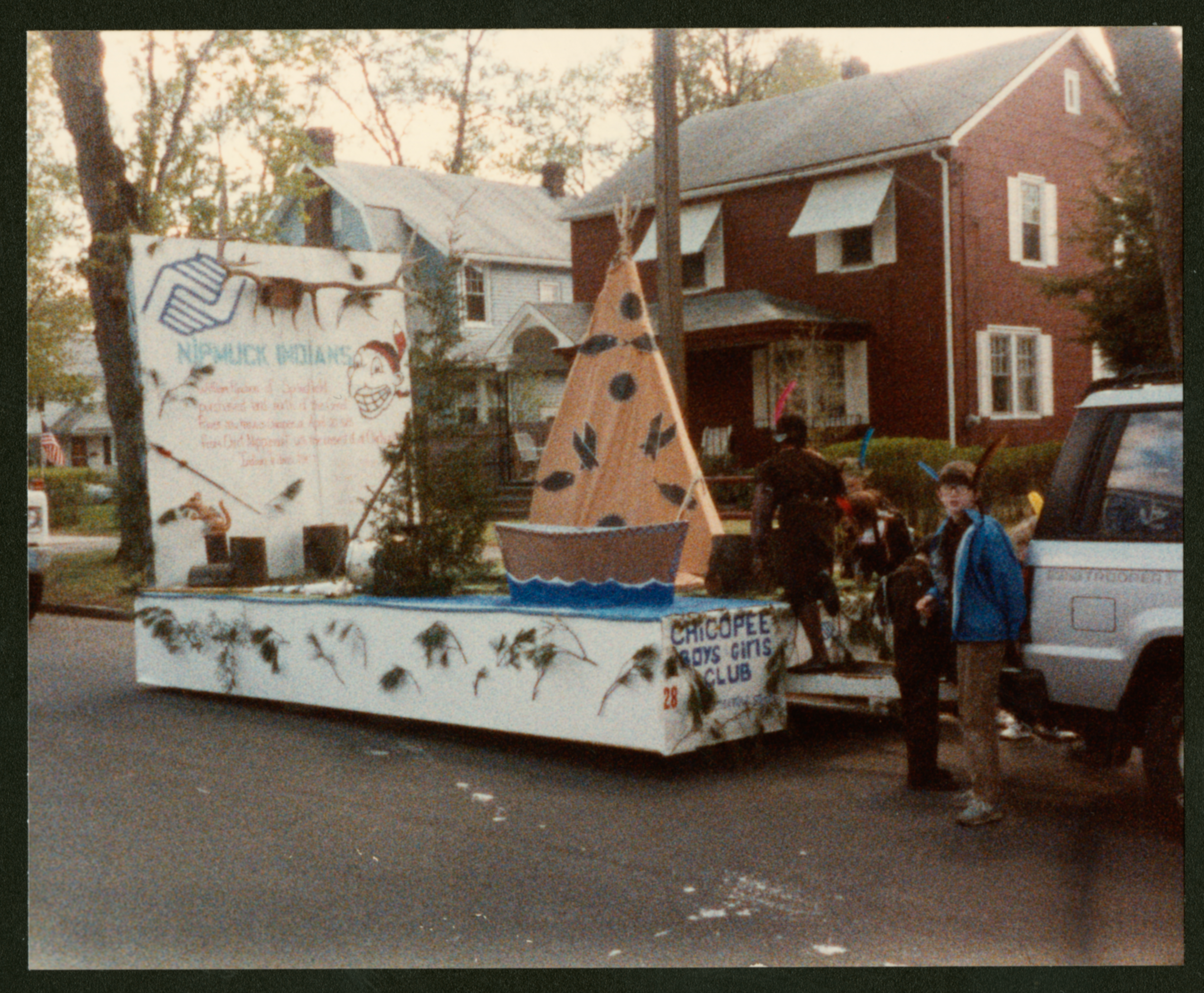 A color photograph of a float by the Chicopee Boys & Girls Club. The float has a sign on the back reading "Nipmuck Indians" and features a racially stereotyped image of an Indigneous mascot. There is a model boat and tipi on the float, as well as some tree stumps and a small sapling. There are several people in front of the float wearing stereotypical "Native" costumes with feathered headbands. [Archivist's note: for information regarding the Nipmuc/k people, please visit nipmucnation.org or nipmuck.org (KO, 2025)]