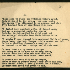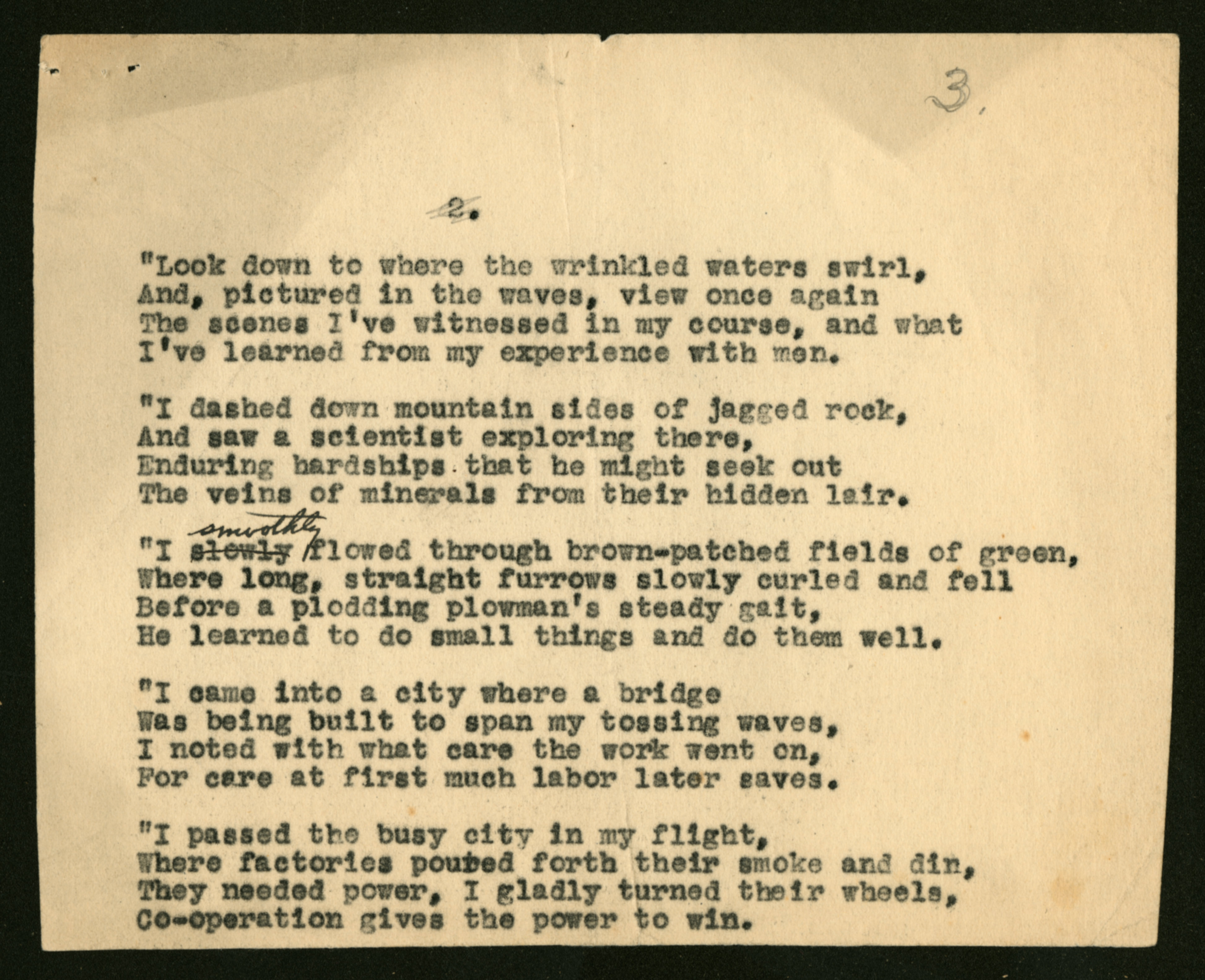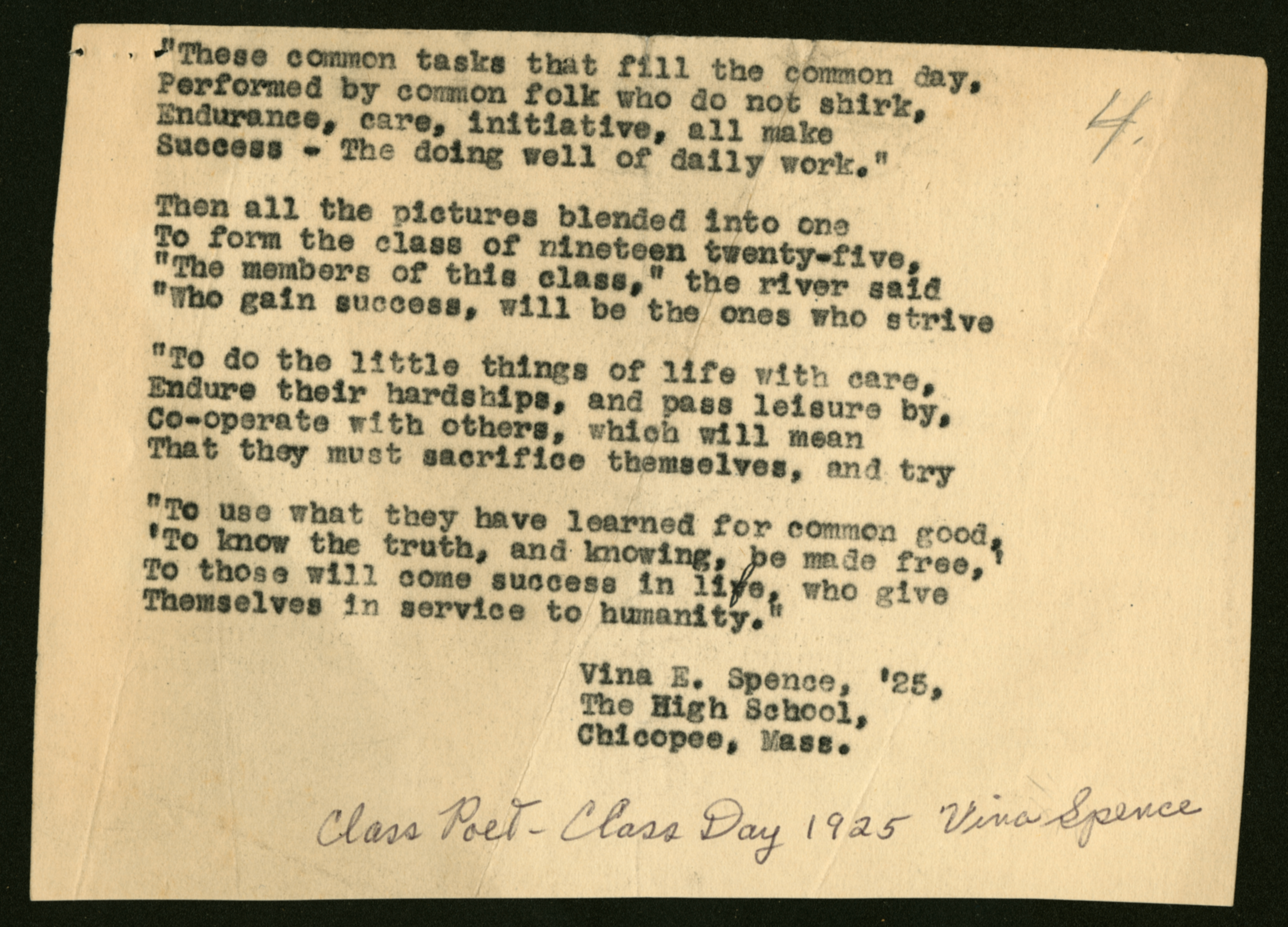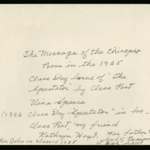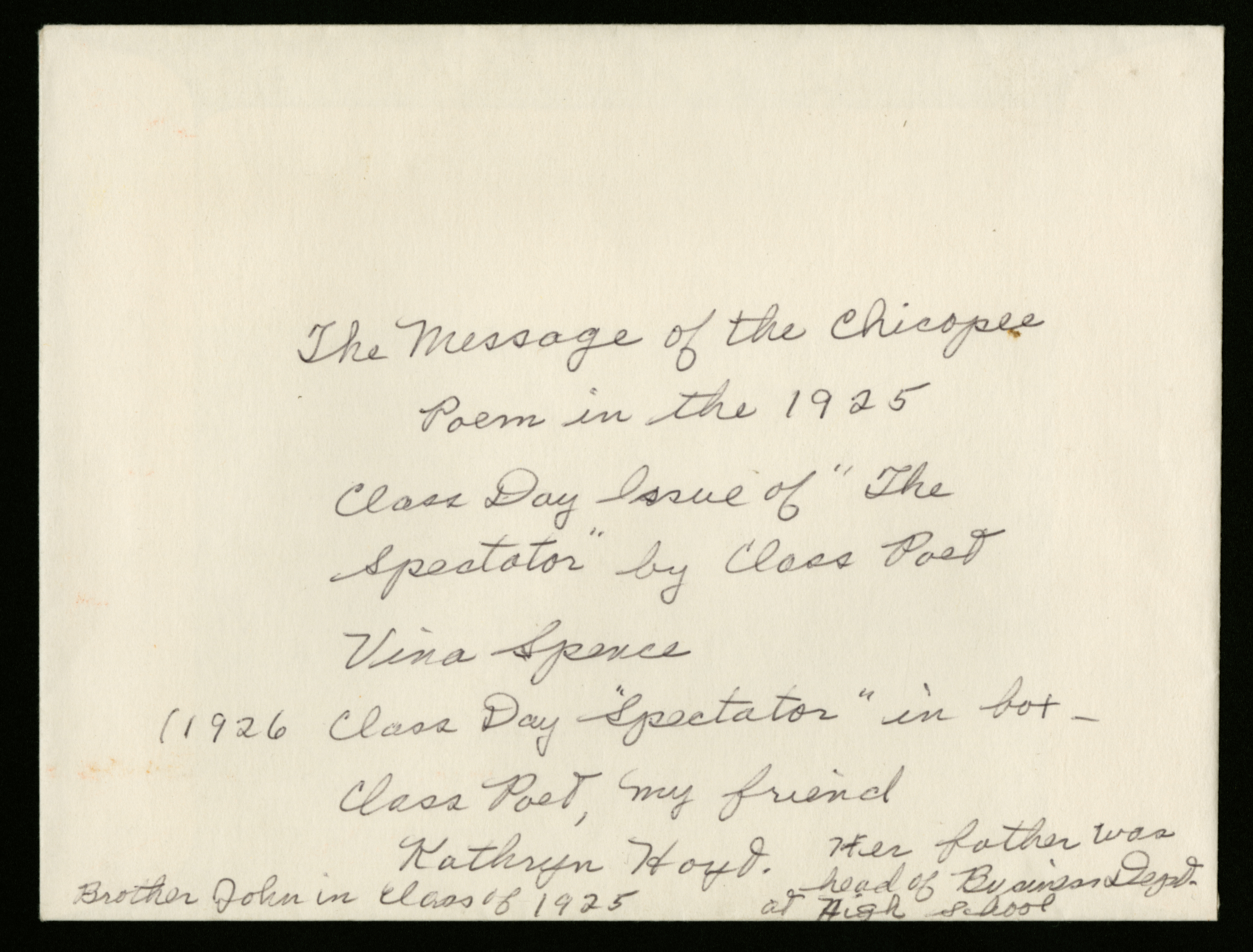A typewritten reproduction of a poem titled "The Message of the Chicopee," originally printed in the 1925 Class Day issue of The Spectator by class poet Vina Spence. The paper has been cut into 4 segments in order to fit inside an envelope (also pictured). The envelope contains an additional note referring to a different item in the collection.