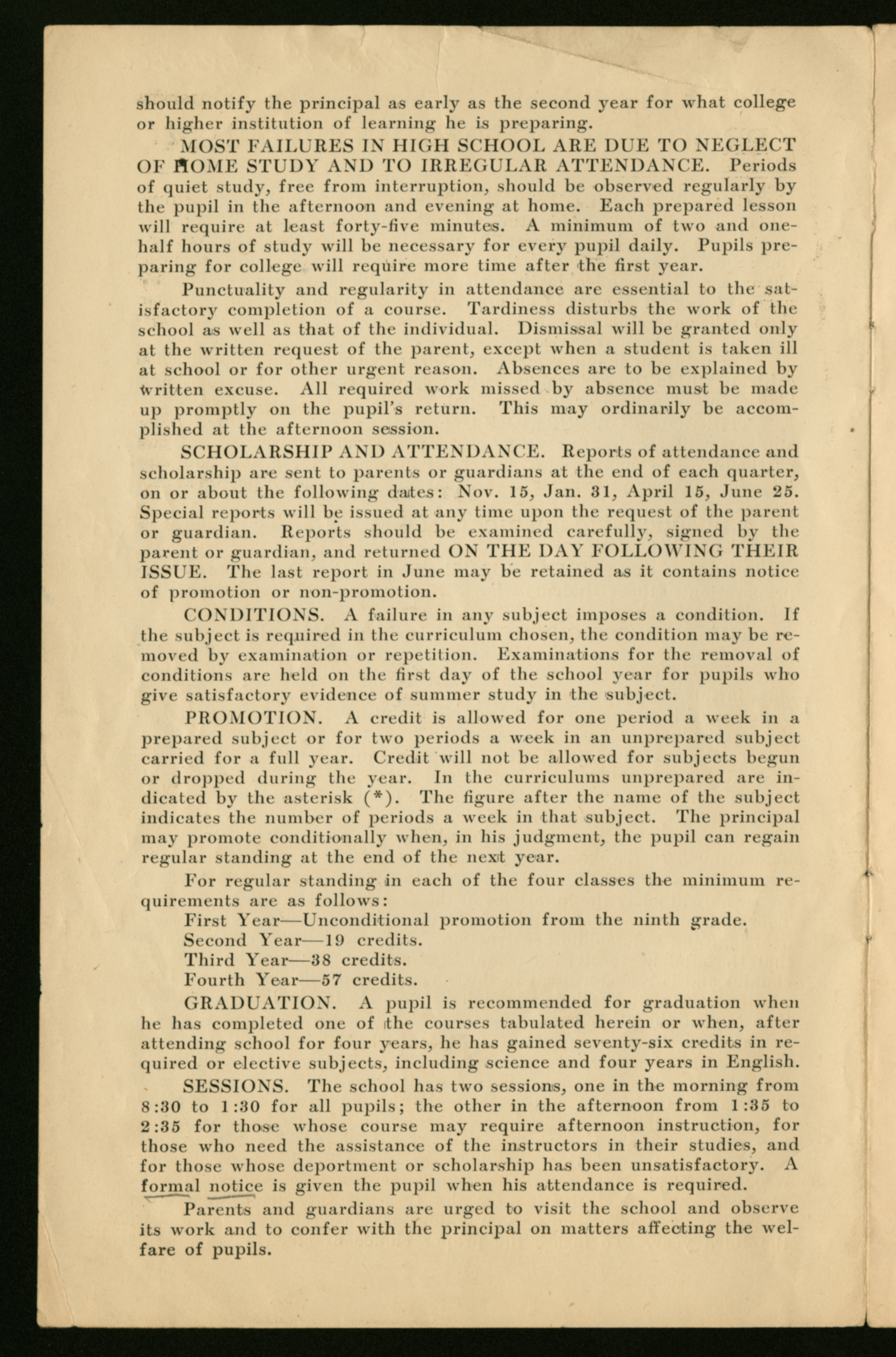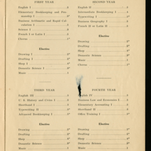 A multi-paged booklet detailing the different curriculums a student could follow at Chicopee High School, with requirements for each one. There are several pencilled-in notes throughout, as well as a small tear in the last leaf.