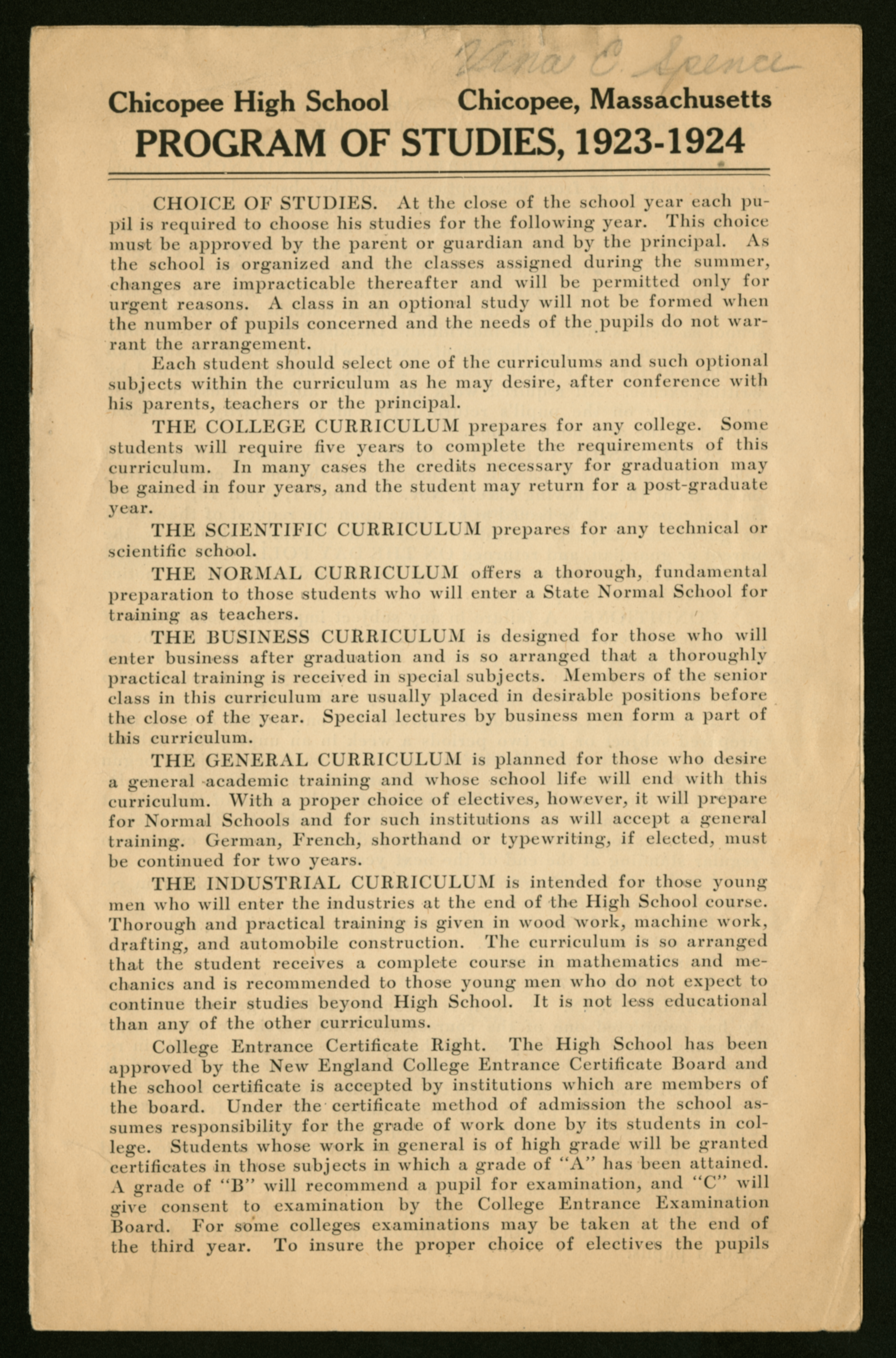 “Chicopee High School Program of Studies, 1923-1924,” Chicopee Archives Online, accessed March 5, 2026, https://www.chicopeepubliclibrary.org/archives/items/show/10284.