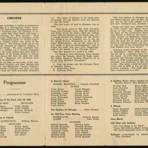 An off-white tri-fold pamphlet regarding Class Day for Chicopee High School, held in the school auditorium on June 7th, 1924 at 3 o'clock. The outside portions provide the when-and-where details, and the inside sections provide a very brief history of Chicopee and a program of events for the day. Events seem to be a series of short plays or vignettes.