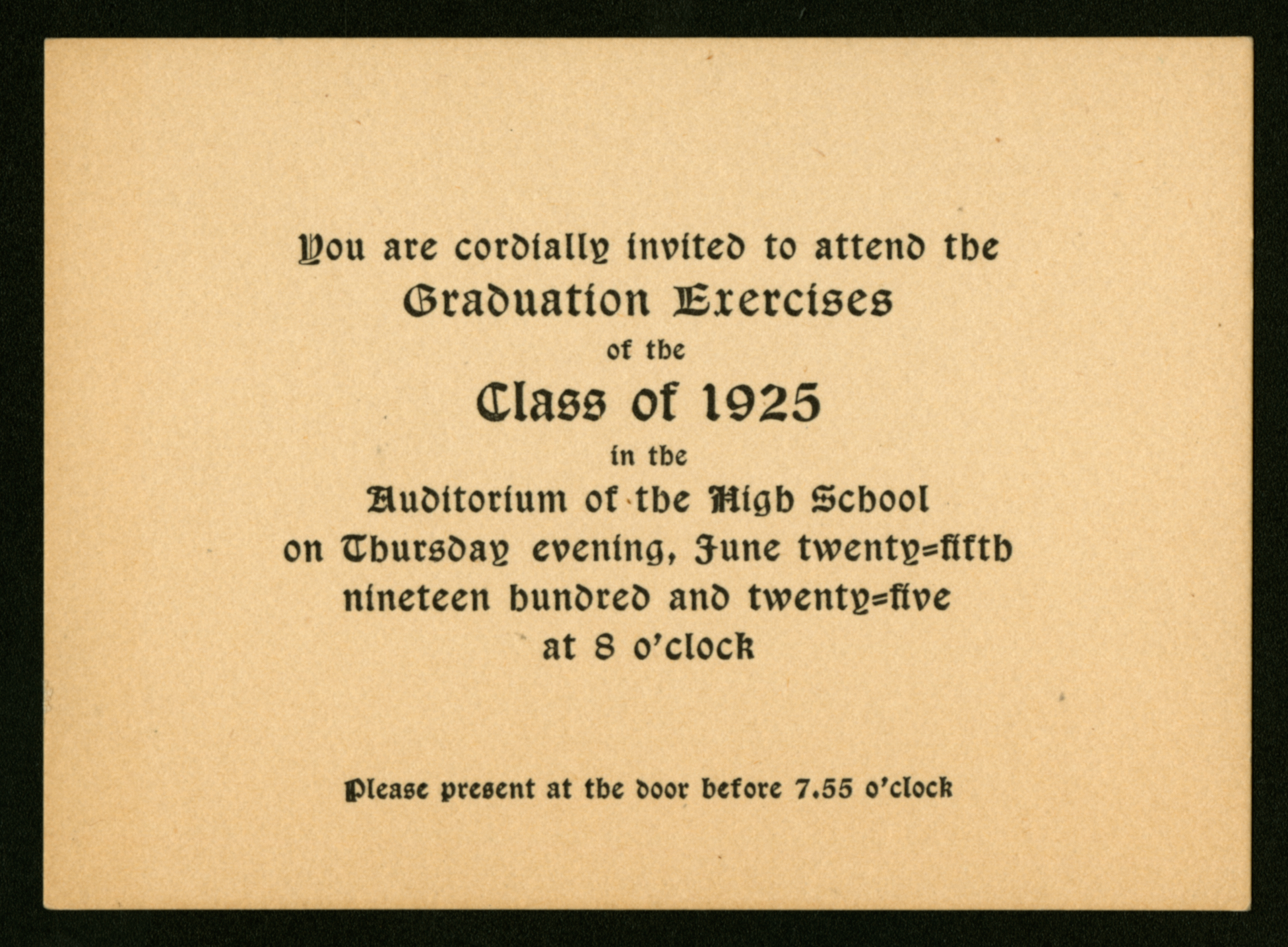 An off-white card reading "You are cordially invited to attend the Graduation Exercises of the Class of 1925 in the Auditorium of the High School on Thursday evening, June twenty-fifth nineteen hundred and twenty-five at 8 o'clock; please present at the door before 7.55 o'clock."