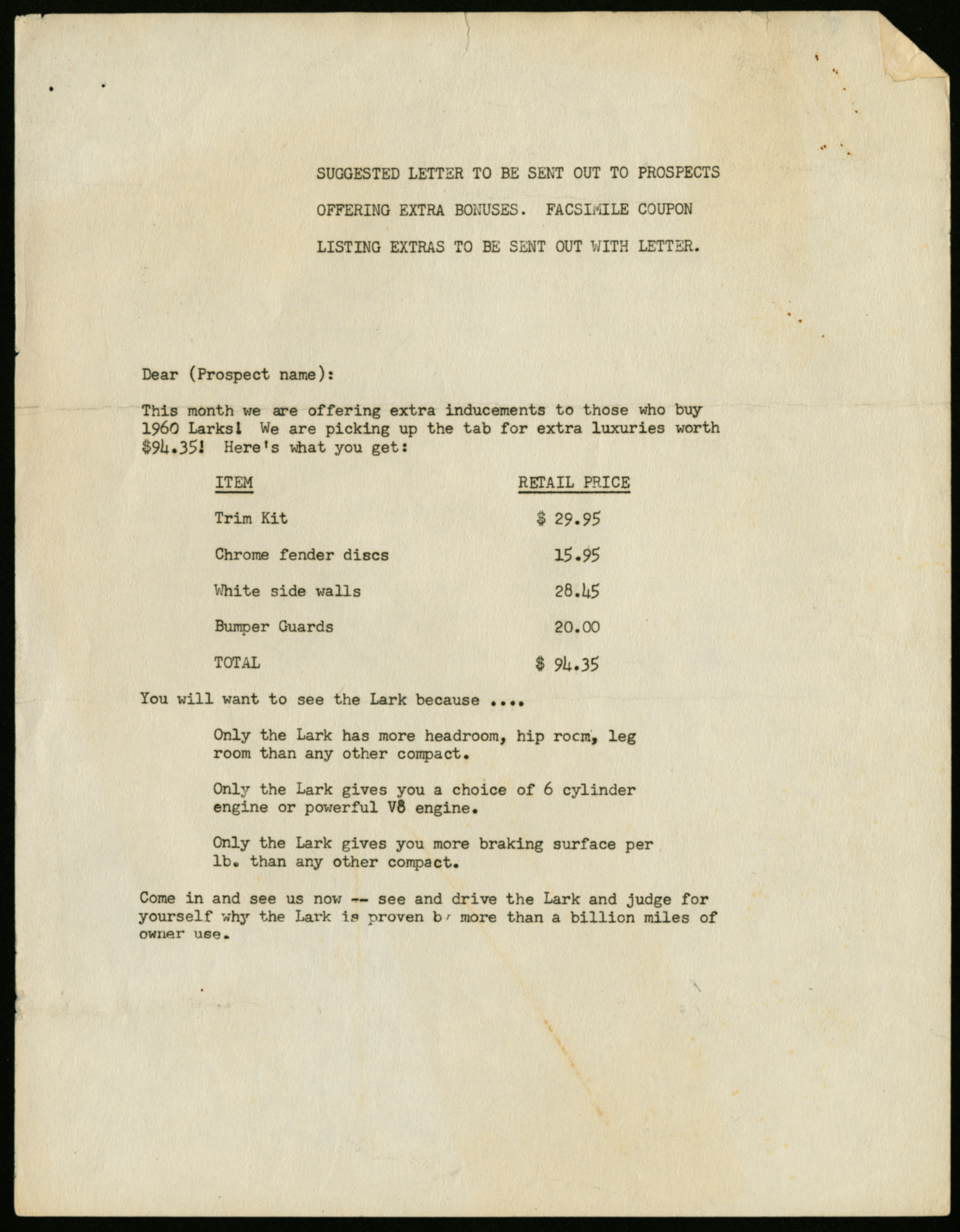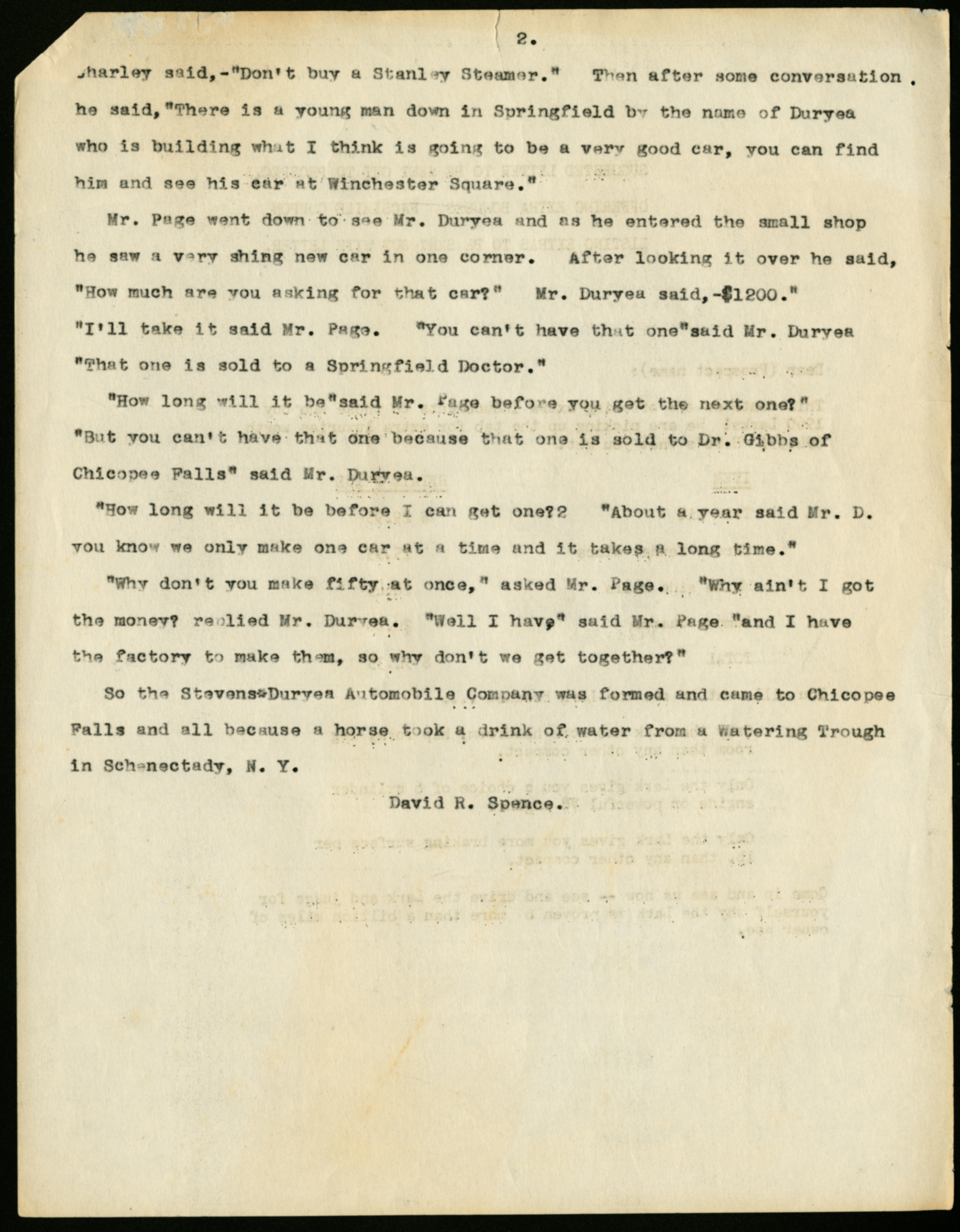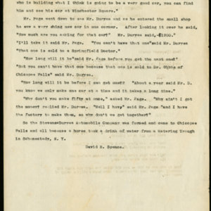 A typewritten story/article about the purported founding of Stevens-Duryea Automobile Company in Chicopee Falls, MA, related by David Spence. The second page is typed on the back of a "suggested letter to be sent out to prospects" interested in buying a 1960 Studebaker Lark.