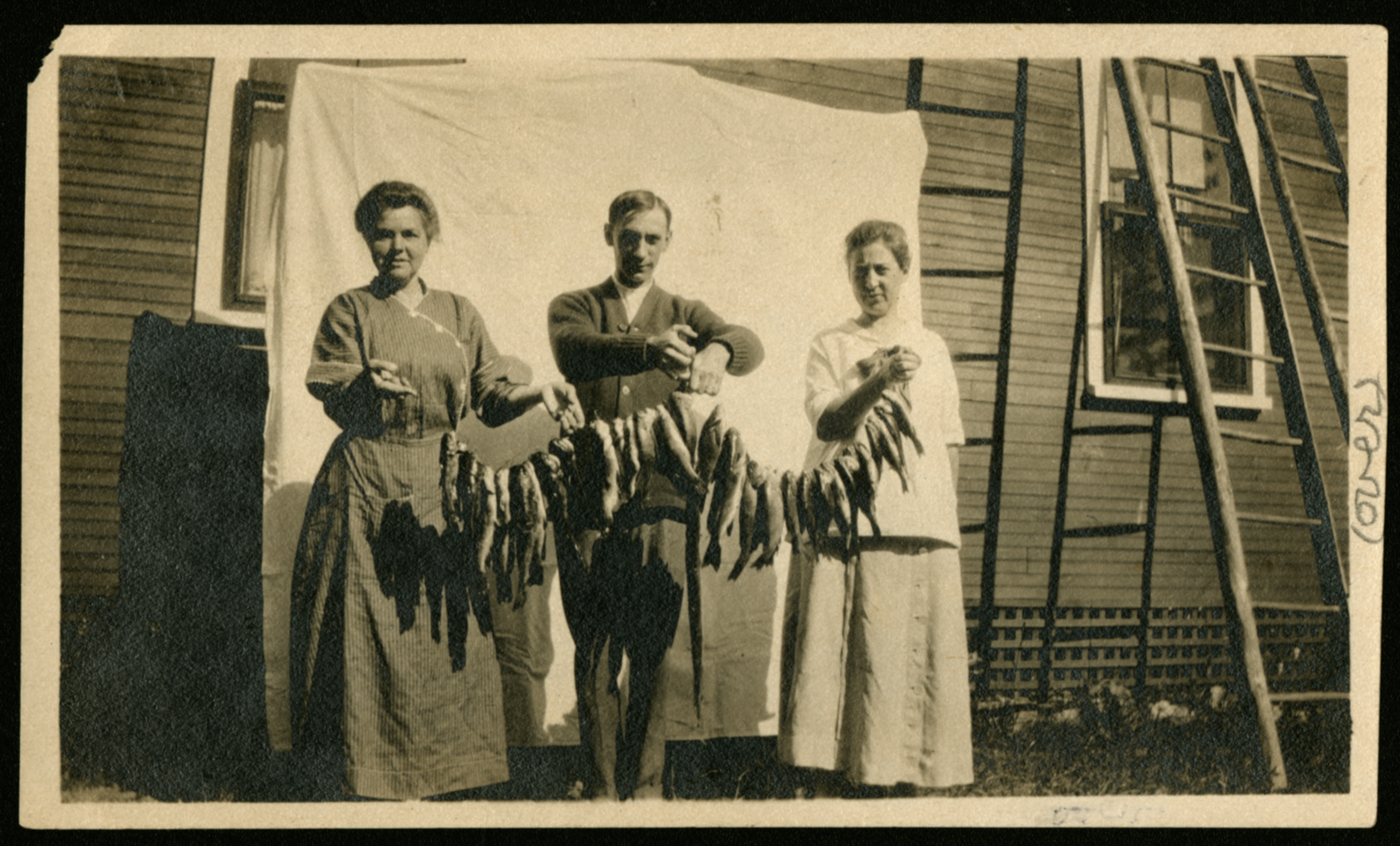A small black and white snapshot of three people standing in front of a house and holding a very full line of fish. The back is hand labeled: "Left to right[;] Alice Meeher Spence[;] David R. Spence[;] Agnes Campbell Dalton (first cousin of David)[;] At Dalton Cottage[,] Bridgeton, Maine[;] Circa 1919[.]" A sheet is hung between the subjects and the house, and two ladders lean against the wall in the right side of the image. The word "over" is written on the front right margin in pencil.